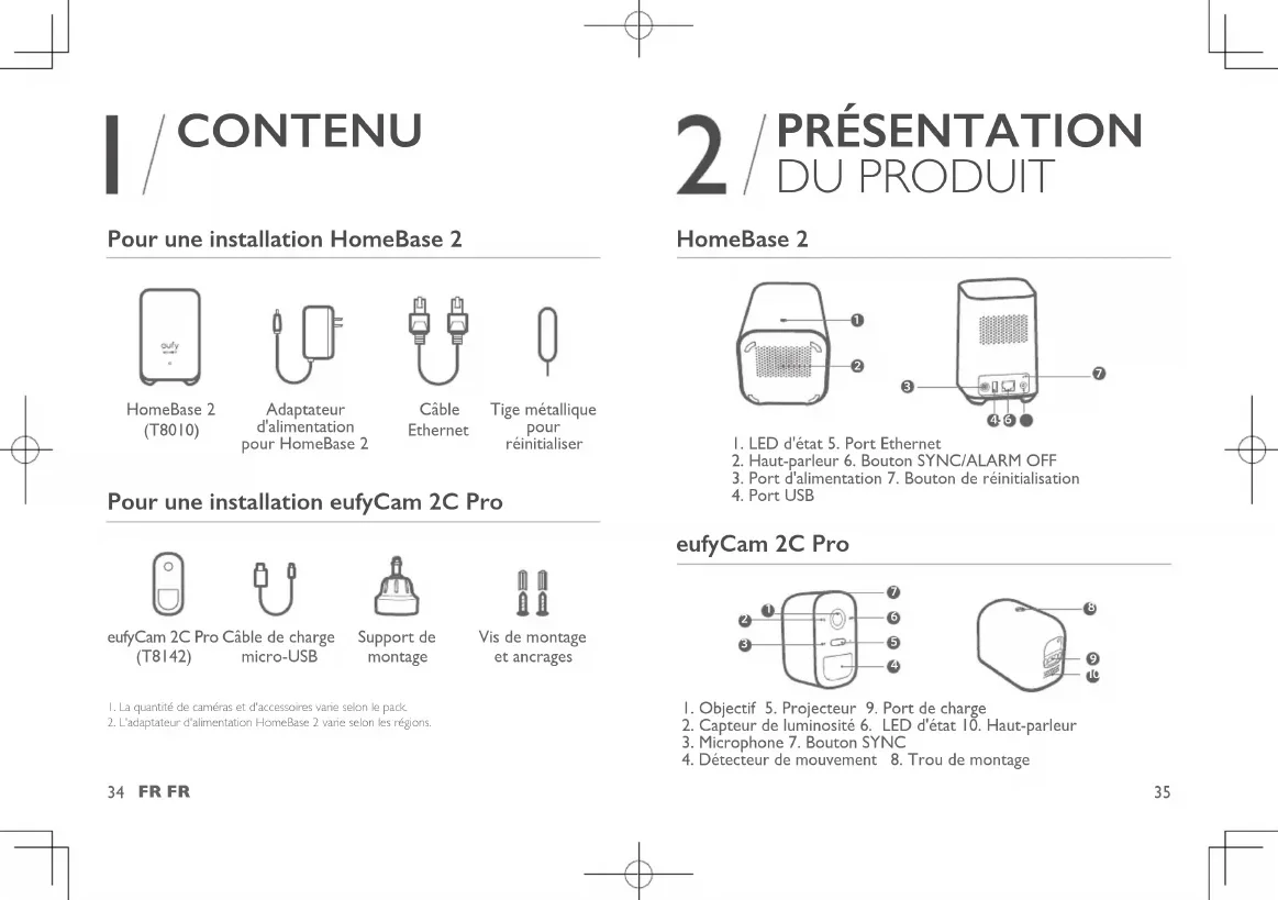 CONTENU Pour une installation HomeBase 2 HomeBase 2 (T8010) Adaptateur d'alimentation pour HomeBase 2 Câble Ethernet Tige métallique pour réinitialiser Pour une installation eufyCam 2C Pro eufyCam 2C Pro (T8142) Câble de charge micro-USB Support de montage Vis de montage et ancrages