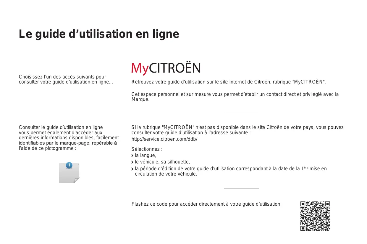 Guide d’utilisation Le guide d’utilisation en ligne Choisissez l’un des accès suivants pour consulter votre guide d’utilisation en ligne... Retrouvez votre guide d’utilisation sur le site Internet de Citroën, rubrique "MyCITROËN". Cet espace personnel et sur mesure vous permet d’établir un contact direct et privilégié avec la Marque. Consulter le guide d’utilisation en ligne vous permet également d’accéder aux dernières informations disponibles, facilement identifiables par le marque-page, repérable à l’aide de ce pictogramme : Si la rubrique "MyCITROËN" n’est pas disponible dans le site Citroën de votre pays, vous pouvez consulter votre guide d’utilisation à l’adresse suivante : http://service.citroen.com/ddb/ Sélectionnez : la langue, le véhicule, sa silhouette, la période d’édition de votre guide d’utilisation correspondant à la date de la 1ère mise en circulation de votre véhicule. Flashez ce code pour accéder directement à votre guide d’utilisation. Ce guide d'utilisation est conçu pour vous faire profiter pleinement de votre C5 dans toutes ses situations de vie, en toute sécurité. Prenez le temps de le lire attentivement afin de vous familiariser avec votre véhicule. Le contenu de ce guide présente toutes les variantes d'équipements disponibles sur l'ensemble de la gamme C5. Votre véhicule reprend une partie des équipements décrits dans ce document, en fonction du niveau de finition, de la version et des caractéristiques propres au pays de commercialisation. Citroën présente, sur tous les continents, une gamme riche, alliant technologie et esprit d'innovation permanent, Les descriptions et figures sont données sans engagement. Automobiles CITROËN se réserve le droit de modifier les caractéristiques techniques, équipements et accessoires sans être tenue de mettre à jour le présent guide. pour une approche moderne et créative de la mobilité. Ce document fait partie intégrante de votre véhicule. Pensez à le remettre au nouveau propriétaire en cas de cession. Au volant de votre nouveau véhicule, Nous vous remercions et vous félicitons de votre choix. connaître chaque équipement, chaque commande, chaque réglage, rend plus confortables et plus agréables Légende vos déplacements, vos voyages. avertissement pour la sécurité information complémentaire contribution à la protection de la nature Bonne route ! Sommaire Vue d’ensemble Ouvertures Clé à télécommande Alarme Lève-vitres électriques Portes Coffre Conduite