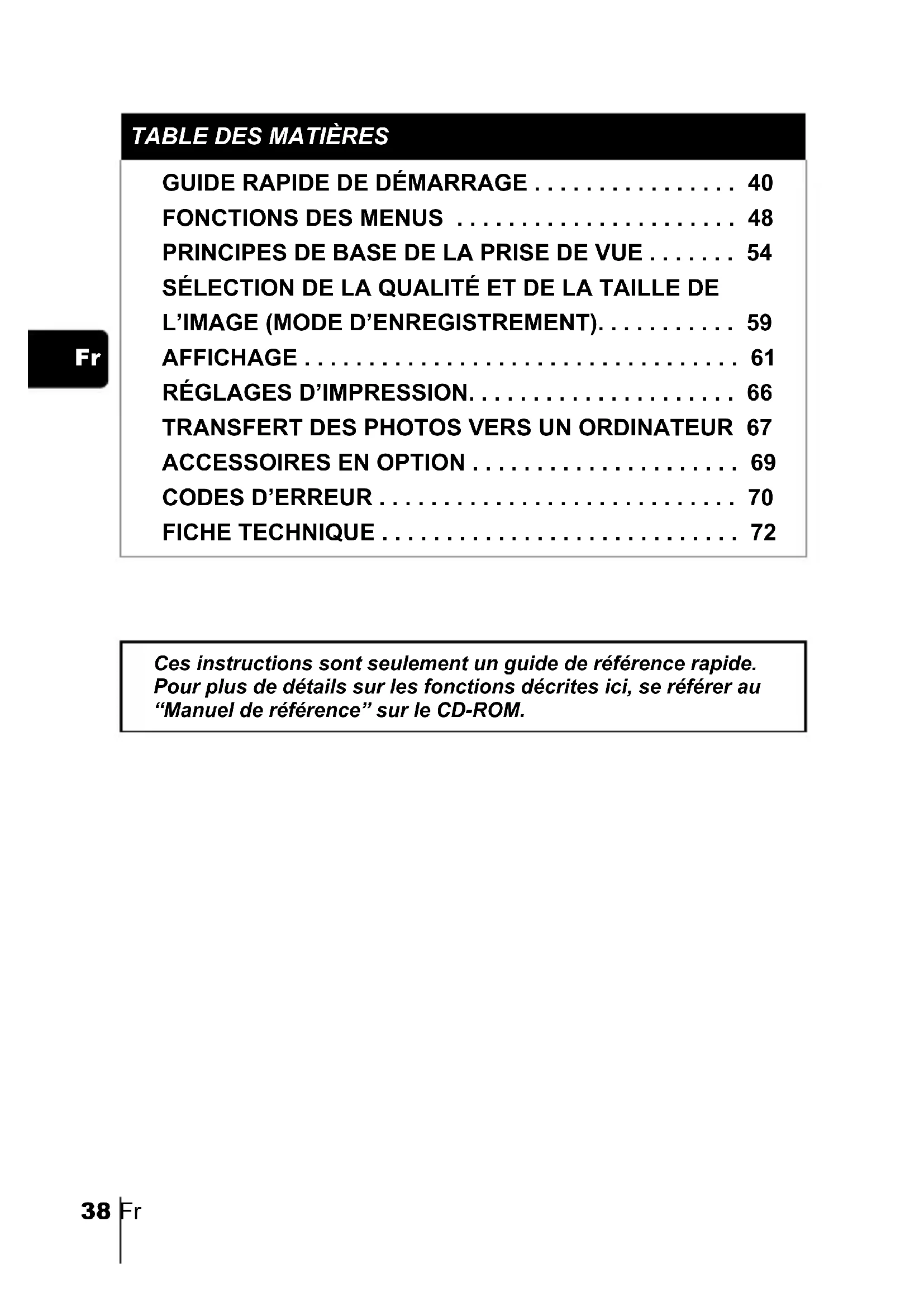 FICHE TECHNIQUE . . . . . . . . . . . . . . . . . . . . . . . . . . . . 72 Ces instructions sont seulement un guide de référence rapide. Pour plus de détails sur les fonctions décrites ici, se référer au “Manuel de référence” sur le CD-ROM.Fr 39