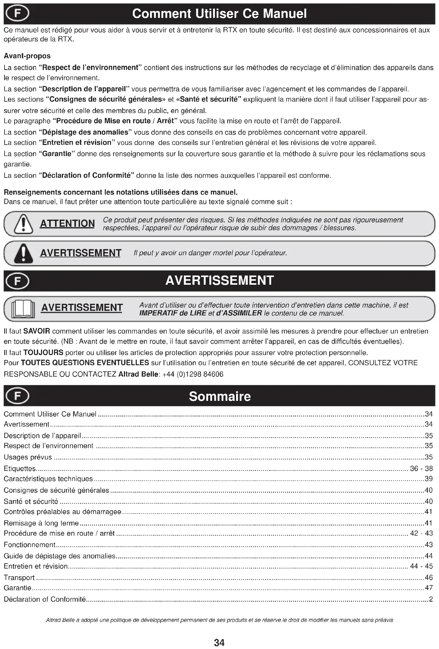 - Déclaration of Conformité Altrad Belle a adopté une politique de développement permanent de ses produits et se réserve le droit de modi¿ er les manuels sans préavis Comment Utiliser Ce Manuel Ce manuel est rédigé pour vous aider à vous servir et à entretenir la RTX en toute sécurité. Il est destiné aux concessionnaires et aux opérateurs de la RTX. Avant-propos La section “Respect de l’environnement” contient des instructions sur les méthodes de recyclage et d’élimination des appareils dans le respect de l’environnement. La section “Description de l’appareil” vous permettra de vous familiariser avec l’agencement et les commandes de l’appareil. Les sections “Consignes de sécurité générales» et «Santé et sécurité” expliquent la manière dont il faut utiliser l’appareil pour as- surer votre sécurité et celle des membres du public, en général. Le paragraphe “Procédure de Mise en route / Arrêt” vous facilite la mise en route et l’arrêt de l’appareil. La section “Dépistage des anomalies” vous donne des conseils en cas de problèmes concernant votre appareil. La section “Entretien et révision” vous donne des conseils sur l’entretien général et les révisions de votre appareil. La section “Garantie” donne des renseignements sur la couverture sous garantie et la méthode à suivre pour les réclamations sous garantie. La section “Déclaration of Conformité” donne la liste des normes auxquelles l’appareil est conforme. Renseignements concernant les notations utilisées dans ce manuel. Dans ce manuel, il faut prêter une attention toute particulière au texte signalé comme suit : AVERTISSEMENT Sommaire Il faut SAVOIR comment utiliser les commandes en toute sécurité, et avoir assimilé les mesures à prendre pour effectuer un entretien en toute sécurité. (NB : Avant de le mettre en route, il faut savoir comment arrêter l’appareil, en cas de dif¿ cultés éventuelles). Il faut TOUJOURS porter ou utiliser les articles de protection appropriés pour assurer votre protection personnelle. Pour TOUTES QUESTIONS EVENTUELLES sur l’utilisation ou l’entretien en toute sécurité de cet appareil, CONSULTEZ VOTRE RESPONSABLE OU CONTACTEZ Altrad Belle: +44 (0)1298 84606 Avant d’utiliser ou d’effectuer toute intervention d’entretien dans cette machine, il est IMPERATIF de LIRE et d’ASSIMILER le contenu de ce manuel. AVERTISSEMENT Il peut y avoir un danger mortel pour l’opérateur. AVERTISSEMENT Ce produit peut présenter des risques. Si les méthodes indiquées ne sont pas rigoureusement respectées, l’appareil ou l’opérateur risque de subir des dommages / blessures. ATTENTION35 Description De L’appareil Usages Prévus Cet appareil est conçu pour la préparation d’assises, d’allées, de fondations, bords de trottoir et semelles. Il peut également servir pour les travaux de réfections des rues, chaussées et / ou trottoirs. Respect De L’environnement Elimination en toute sécurité. Instructions pour le respect de l’environnement. Cet appareil contient des matériaux recyclables. Pour vous débarrasser de l’appareil, prière d’emmener l’appareil et les accessoires dans une décharge de recyclage agréé. Composant Matériau Poignée Acier Patin de compactage Contreplaqué et Acier ou Nylon et Acier Montants souples Acier et caoutchouc SoufÀ et Uréthanne Carter-moteur Aluminium Couvercle de carter Aluminium Pignons Acier Moteur Acier et Aluminium Roue de Transport HDPE Pièces plastiques divers Polypropylène Autres pièces Acier et Aluminium p. 2