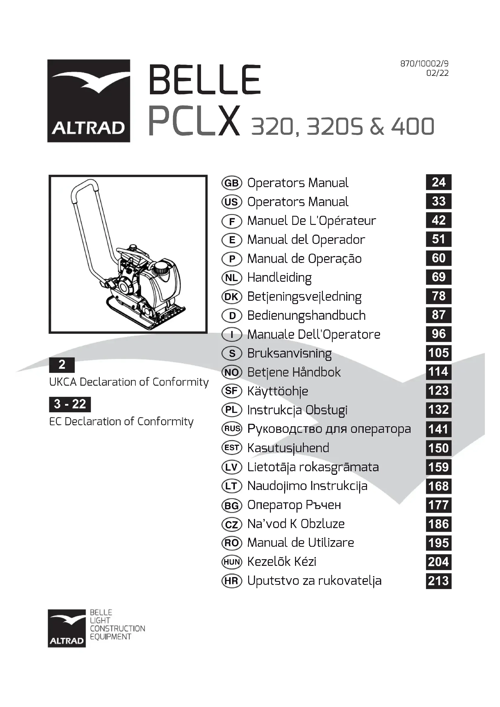 Déclaration CE de conformité (DdC) Nous, Altrad Belle, Sheen, Nr. Buxton, Derbyshire, SK17 0EU, GB déclarons que la DdC est émisse sous notre seule responsabilité et qu'elle appartient au(x) produit(s) suivants: Directeur GénéralAu nom de Altrad BelleSheen, Derbyshire, R.-U. Ray Neilson Signée par:866/10000/0_F Voir page 3 pour cette information TYPE DE PRODUIT.....................................MODÈLE......................................................No DE SÉRIE...............................................DATE DE FABRICATION.............................NIVEAU DE PUISSANCE ACOUSTIQUEMESURÉ /........................................................................(GARANTI)POIDS .......................................................... Objet de la déclaration: Single-direction plate compactor used for soil compaction on new developments, repairs and maintenance jobs with large aggregates, cohesive material or moist content. L'objet de la déclaration décrite ci-dessus est conforme à la législation de l'Union européenne en matière d'harmonisation: - 2006/42/EC Directive relative aux machines - 2000/14/EC Émissions sonores - matériels utilisés à l'extérieur Les normes et les spécifications techniques harmonisées suivantes ont été appliquées: - EN ISO 12100:2010 Sécurité des machines - EN 500-4:2011 Machines mobiles de construction de routes. Sécurité. - ISO 3744:2010 Acoustique - Détermination des niveaux de puissance acoustique et des niveaux d'énergie acoustique des sources de bruit à l'aide de la pression acoustique VINÇOTTE nv/sa (NB0026) a effectué un contrôle interne de la production avec évaluation de la documentation technique et vérification périodique conformément à l'annexe VI de la directive 2000/14/CE Les dossiers techniques sont détenus par Hugues Menager à l'adresse suivante:- Altrad (Group Holding), 125 Rue du Mas Carbonnier, 34000, Montpellier, France. Lieu de la déclaration:- Sheen, Nr. Buxton, Derbyshire, SK17 0EU,
