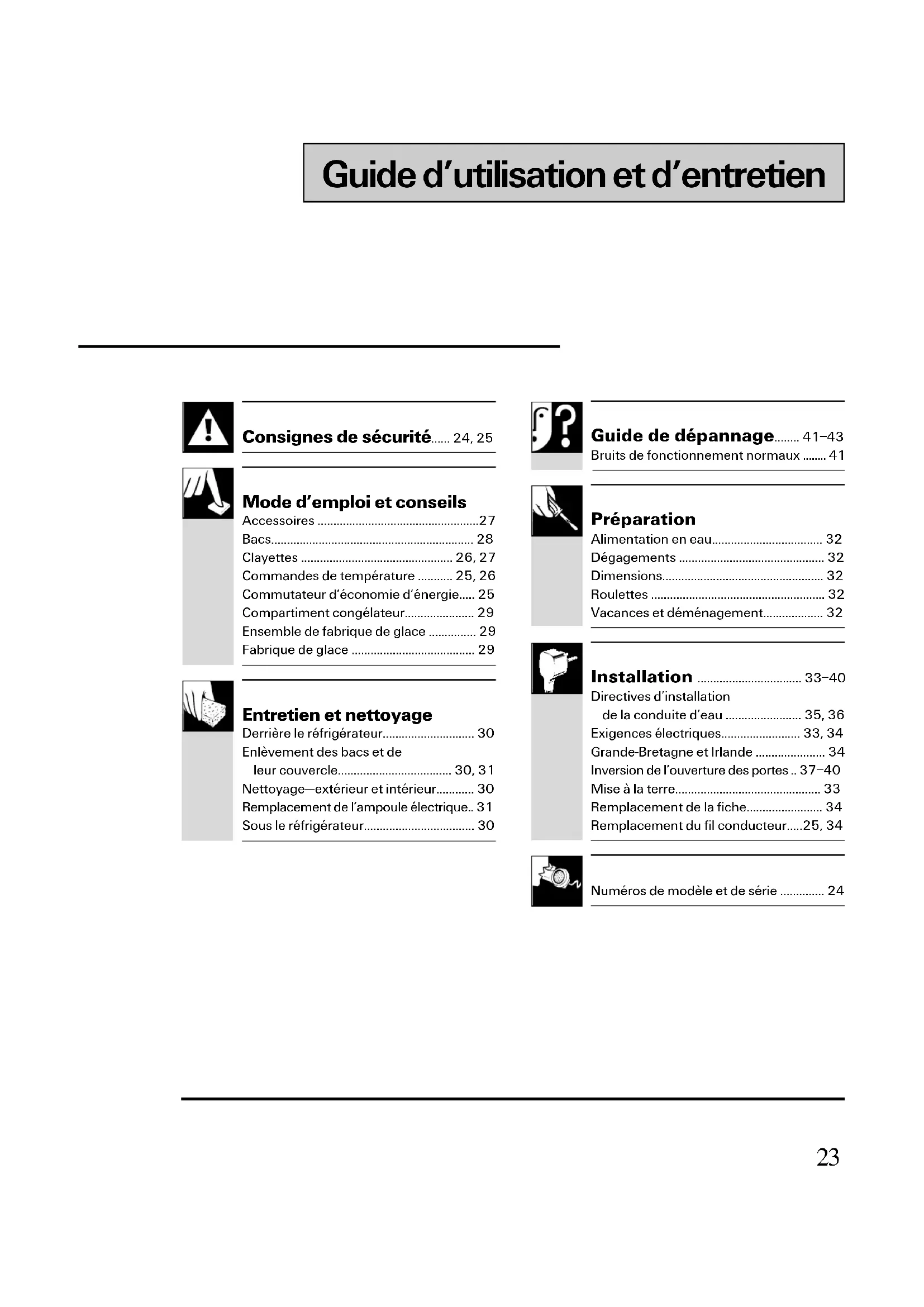 - , 34 Numéros de modèle et de série AIDEZ-NOUS À VOUS AIDER… Lisez attentivement ce guide. Inscrivez les numéros de modèle et de série. Il est conçu pour vous aider à faire fonctionner et entretenir correctement votre nouveau réfrigérateur. Gardez-le à portée de main pour le consulter en cas de doute. Si le réfrigérateur qui vous a été livré est endommagé… Communiquez immédiatement avec le marchand (ou le revendeur) qui vous a vendu le réfrigérateur. Économisez du temps et de l’argent. Avant d’appeler le service de réparation… Consultez le Guide de dépannage. Il contient une liste des problèmes mineurs de fonctionnement auxquels vous pouvez vous-même remédier. Ils figurent sur l’étiquette qui se trouve sur la paroi de gauche près du haut du compartiment réfrigérateur. Numéro de modèle Numéro de série Mentionnez les numéros de modèle et de série dans toute correspondance concernant votre réfrigérateur ou lorsque vous appelez le service de réparation. AVERTISSEMENT—Lorsque vous utilisez le réfrigérateur, observez toujours certaines précautions de base, notamment : p. 24