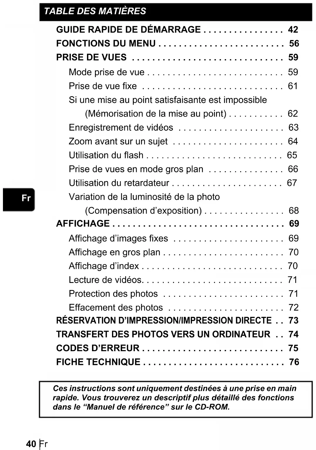 FICHE TECHNIQUE . . . . . . . . . . . . . . . . . . . . . . . . . . . . 76 Ces instructions sont uniquement destinées à une prise en main rapide. Vous trouverez un descriptif plus détaillé des fonctions dans le “Manuel de référence” sur le CD-ROM. x450_Basic.book 40 ページ 2004年8月2日 月曜日 午前9時36分Fr 41