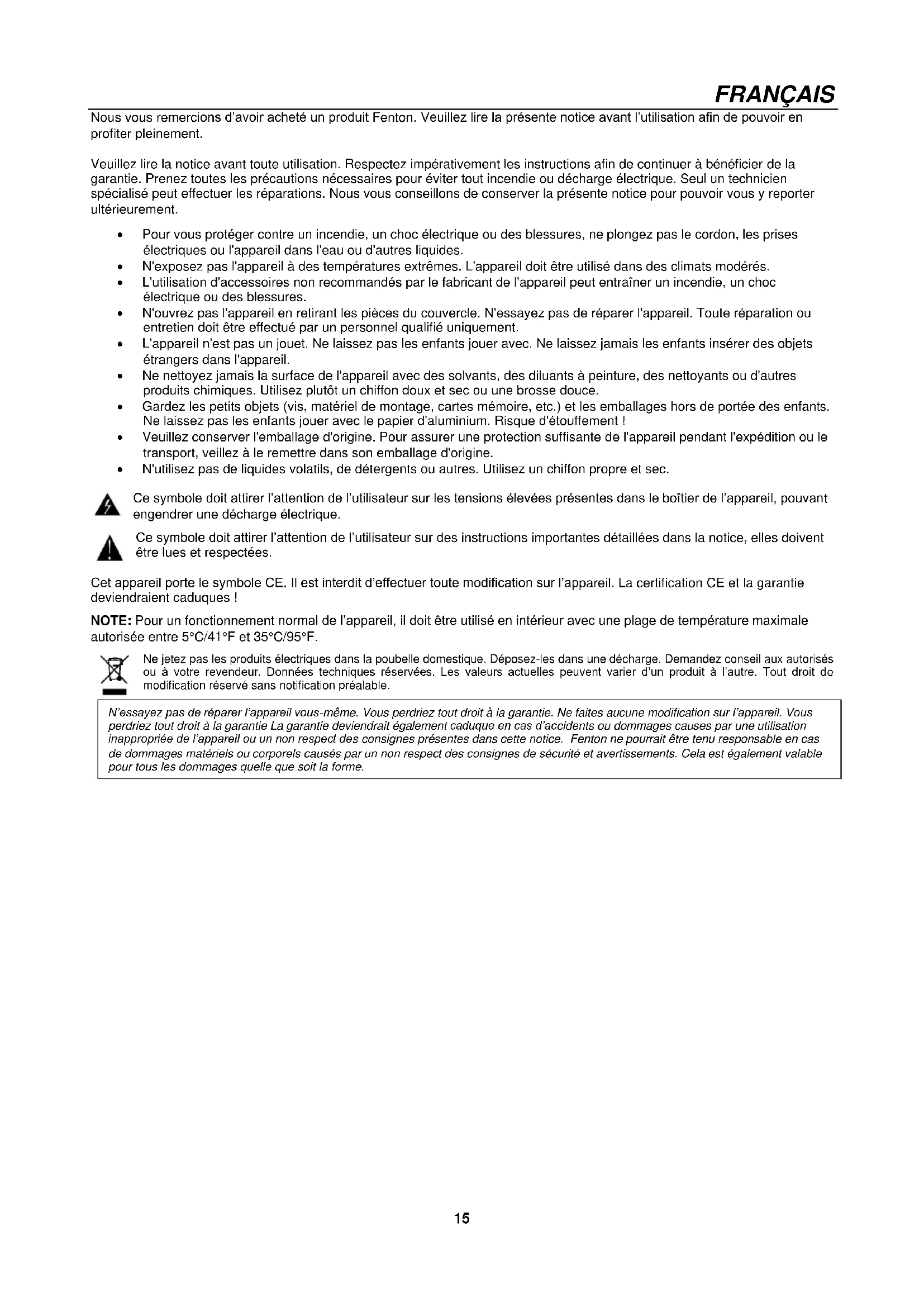Utilice un cable de carga USB apropiado (no incluido), conecte un extremo al dispositivo y el otro al puerto de carga USB de la unidad. Asegúrese de que la unidad esté enchufada a la toma de corriente. TALK OVER Cuando hable o cante sobre la música, seguramente querrá atenuar la música. El altavoz del karaoke de SBS hace esto por ti automáticamente. La sensibilidad puede ser controlada por el control de "Talk Over".15 FRANÇAIS Nous vous remercions d’avoir acheté un produit Fenton. Veuillez lire la présente notice avant l’utilisation afin de pouvoir en profiter pleinement. Veuillez lire la notice avant toute utilisation. Respectez impérativement les instructions afin de continuer à bénéficier de la garantie. Prenez toutes les précautions nécessaires pour éviter tout incendie ou décharge électrique. Seul un technicien spécialisé peut effectuer les réparations. Nous vous conseillons de conserver la présente notice pour pouvoir vous y reporter ultérieurement.
