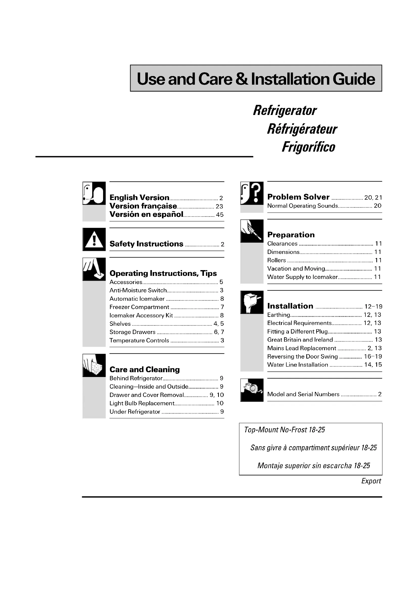 arrière du couvercle dans le profilé arrière du cadre. Ensuite, abaissez lentement le couvercle pour qu’il soit bien en place. Cadre Glissière du bac (extrémité en biseau) Remplacement de l’ampoule Une ampoule et une douille sont installées à la partie supérieure du réfrigérateur en face du tableau de commande de température. Sur certains modèles une ampoule et une douille sont également situées dans le coin supérieur gauche du compartiment des aliments surgelés derrière un écran protecteur flexible. Pour remplacer l’une ou l’autre des ampoules, débranchez le réfrigérateur de sa prise de courant et enlevez l’écran protecteur; laissez refroidir l’ampoule puis dévissez-la et remplacez-la par une ampoule de la même taille. Lorsque vous remettez l’écran protecteur en place, assurez-vous que la tige de l’écran protecteur est insérée dans la fente de son support. Ensuite, faites pivoter l’écran protecteur vers l’arrière et vers le haut jusqu’à ce qu’il soit bien en place. Fente Tige 31Dégagements Prévoyez les dégagements suivants pour faciliter l’installation, assurer une circulation d’air adéquate et permettre les raccordements d’électricité et de plomberie : Côtés ..............................................................................19 mm Dessus ............................................................................25 mm Arrière ............................................................................25 mm Si le modèle 19, 22 ou 25 doit être installé contre un mur du côté des charnières, prévoyez 38 mm de jeu pour le dégagement de la porte. Alimentation en eau de la fabrique de glace (sur certains modèles) Si votre réfrigérateur est muni d’une fabrique de glace, ou si vous prévoyez d’en ajouter une ultérieurement, vous devez la raccorder à une conduite d’eau froide potable. Moyennant un supplément, vous pouvez vous procurer un ensemble comprenant un tuyau de cuivre, un robinet d’arrêt, des raccords et des directives chez votre distributeur local. La longueur du tuyau reliant la fabrique de glace à la conduite d’eau froide doit être suffisante pour que vous puissiez éloigner le réfrigérateur du mur (environ 244 cm de tuyau en cuivre de 1/4 de pouce enroulé pour former trois boucles d’environ 25 cm de diamètre). N’utilisez pas d’ensembles avec du tuyau en plastique comme il y a toujours de la pression d’eau dans la conduite d’eau. Limite maximum de pression d’arrivée d’eau : 8,3 bars. Limite minimum de pression d’arrivée d’eau : 1,4 bars. L’installation de la fabrique de glace doit être effectuée par un technicien qualifié. PRÉPARATION Roulettes Certains modèles ont des roulettes réglables pour vous permettre d’écarter le réfrigérateur du mur pour le nettoyage. Les roulettes doivent être réglées de sorte que le réfrigérateur repose solidement sur le sol et que l’avant de celui-ci soit soulevé suffisamment (environ 19 mm) pour que les portes ferment facilement lorsqu’elles sont à demi- ouvertes. Retirez la grille inférieure en tenant le bas de la grille et en la tirant. Tournez les deux vis de réglage de la roulette avant dans le sens des aiguilles d’une montre pour soulever le réfrigérateur, dans le sens inverse pour l’abaisser. Pour remettre en place la grille inférieure, alignez les agrafes à l’arrière de la grille avec les ouvertures dans la base et poussez sur la grille jusqu’à ce qu’elle soit bien en place. Départ en vacances Déménagement Lorsque vous partez pour peu de temps, retirez les aliments périssables du réfrigérateur et laissez les commandes aux réglages habituels. Toutefois, si la température de la pièce risque d’être inférieure à 16 °C, suivez les mêmes directives que pour une absence prolongée. Si vous vous absentez pour une longue période, débranchez le réfrigérateur, réglez la commande de température du réfrigérateur à «0» et nettoyez l’intérieur du réfrigérateur avec une solution d’eau et de bicarbonate de soude à raison de 15 ml par litre d’eau. Essuyez. Pour empêcher l’apparition d’odeurs, laissez une boîte ouverte de bicarbonate de soude dans le réfrigérateur et laissez les portes ouvertes. Réglez le bras régulateur de la fabrique de glace à la position STOP (ARRÊT—relevé) et prenez soin de fermer le robinet d’arrêt de la conduite d’eau du réfrigérateur. Débranchez le cordon d’alimentation, retirez tous les aliments du réfrigérateur, nettoyez et séchez l’intérieur. Immobilisez toutes les pièces amovibles, tels que la grille, les clayettes et les bacs, avec du ruban adhésif pour éviter de les endommager. Assurez-vous que le réfrigérateur demeure debout pendant son déménagement et dans le camion. Il doit être bien immobilisé dans le camion afin d’éviter qu’il se déplace. Protégez la carrosserie du réfrigérateur avec une couverture. Dimensions Modèle 18 19 21 22 24 25 A* 163 cm 163 cm 168 cm 168 cm 170 cm 170 cm B 75 cm 75 cm 79 cm 79 cm 87 cm 87 cm C** 80 cm 83 cm 80 cm 83 cm 80 cm 83 cm D 147 cm 147 cm 152 cm 152 cm 160 cm 160 cm E 70 cm 70 cm 70 cm 70 cm 70 cm 70 cm **La charnière n’est pas comprise dans la hauteur—Ajoutez 22 mm de hauteur pour la charnière. **La poignée est comprise dans la profondeur.