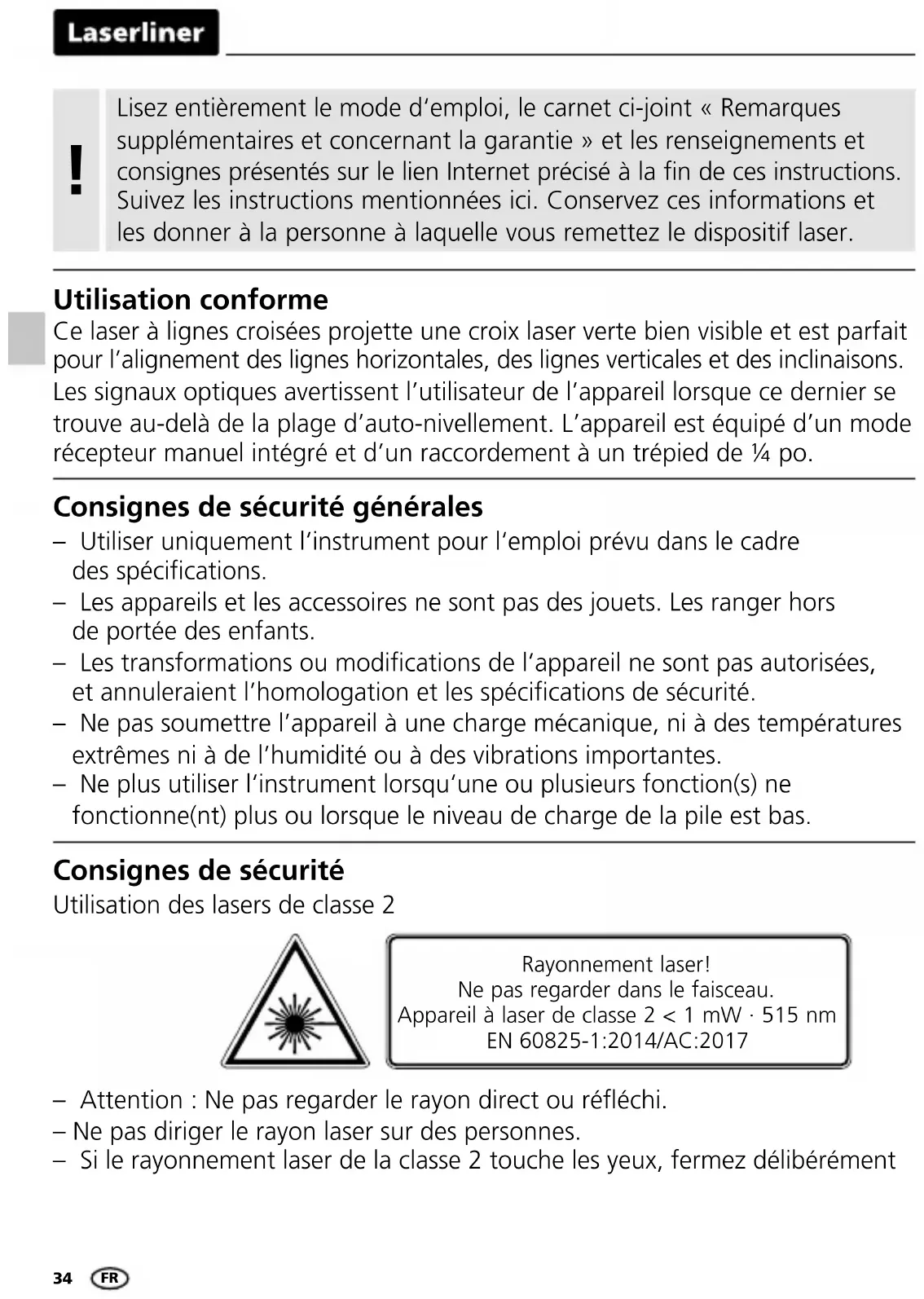 – Attention : Ne pas regarder le rayon direct ou rééchi. – Ne pas diriger le rayon laser sur des personnes. – Si le rayonnement laser de la classe 2 touche les yeux, fermez délibérément Rayonnement laser! Ne pas regarder dans le faisceau. Appareil à laser de classe 2 < 1 mW · 515 nm EN 60825-1:2014/AC:2017 Consignes de sécurité Utilisation des lasers de classe 2 Consignes de sécurité générales – Utiliser uniquement l‘instrument pour l‘emploi prévu dans le cadre des spécications. – Les appareils et les accessoires ne sont pas des jouets. Les ranger hors de portée des enfants. – Les transformations ou modications de l’appareil ne sont pas autorisées, et annuleraient l’homologation et les spécications de sécurité. – Ne pas soumettre l’appareil à une charge mécanique, ni à des températures extrêmes ni à de l’humidité ou à des vibrations importantes. – Ne plus utiliser l‘instrument lorsqu‘une ou plusieurs fonction(s) ne fonctionne(nt) plus ou lorsque le niveau de charge de la pile est bas. Lisez entièrement le mode d‘emploi, le carnet ci-joint «Remarques supplémentaires et concernant la garantie» et les renseignements et consignes présentés sur le lien Internet précisé à la fin de ces instructions. Suivez les instructions mentionnées ici. Conservez ces informations et les donner à la personne à laquelle vous remettez le dispositif laser. !PocketCross-Laser 2G