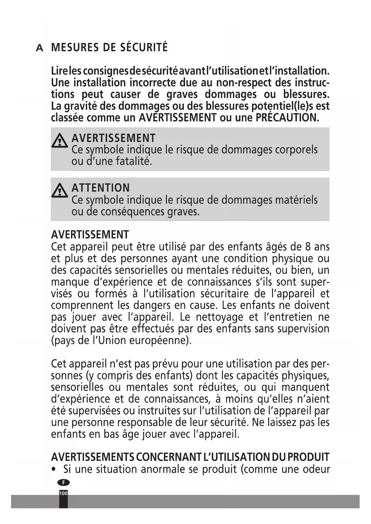 Lire les consignes de sécurité avant l’utilisation et l’installation. Une installation incorrecte due au non-respect des instruc- tions peut causer de graves dommages ou blessures. La gravité des dommages ou des blessures potentiel(le)s est classée comme un AVERTISSEMENT ou une PRÉCAUTION. AVERTISSEMENT Ce symbole indique le risque de dommages corporels ou d’une fatalité. ATTENTION Ce symbole indique le risque de dommages matériels ou de conséquences graves. AVERTISSEMENT Cet appareil peut être utilisé par des enfants âgés de 8 ans et plus et des personnes ayant une condition physique ou des capacités sensorielles ou mentales réduites, ou bien, un manque d’expérience et de connaissances s’ils sont super- visés ou formés à l’utilisation sécuritaire de l’appareil et comprennent les dangers en cause. Les enfants ne doivent pas jouer avec l’appareil. Le nettoyage et l’entretien ne doivent pas être effectués par des enfants sans supervision (pays de l’Union européenne). Cet appareil n’est pas prévu pour une utilisation par des per- sonnes (y compris des enfants) dont les capacités physiques, sensorielles ou mentales sont réduites, ou qui manquent d’expérience et de connaissances, à moins qu’elles n’aient été supervisées ou instruites sur l’utilisation de l’appareil par une personne responsable de leur sécurité. Ne laissez pas les enfants en bas âge jouer avec l’appareil.