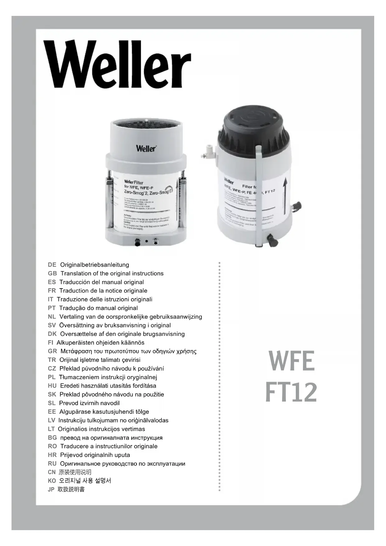 ESPAÑOL Símbolos ¡Atención! ¡Leer el manual de instrucciones! Puesto de trabajo y producto fabricado de conformidad con las normas ESD Design Peligro de aplastamiento Eliminación de residuos Los residuos de aparatos eléctricos y electrónicos se deben recoger y desechar por separado. Retire las fuentes de iluminación de los aparatos antes de desecharlos. Infórmese en las autoridades locales o en su distribuidor especializado sobre los centros de reciclaje y los puntos de recogida. Dependiendo de las disposiciones locales al respecto, los distribuidores minoristas pueden estar obligados a aceptar de forma gratuita la devolución de residuos de aparatos eléctricos y electrónicos. Contribuya mediante la reutilización y el reciclaje de sus residuos de aparatos eléctricos y electrónicos a reducir la demanda de materias primas. Los residuos de aparatos eléctricos y electrónicos contienen valiosos materiales reutilizables que pueden tener efectos negativos para el medio ambiente y su salud si no son desechados de forma respetuosa con el medio ambiente. Antes de desecharlos, elimine los datos personales que podría haber en los residuos de sus aparatos. Elimine los componentes y ltros cambiados en el aparato, así como aparatos en desuso, siguiendo la normativa vigente en su país. Desechar los ltros sucios como residuos especiales. Marcado CE Marcado de conformidad británico23 Lire entièrement ce manuel et les consignes de sécurité ci-joints avant la mise en service et avant de travailler avec l‘appareil. Conserver le présent manuel de telle manière qu‘il soit accessible à tous les utilisateurs. Consignes de sécuritée AVERTISSEMENT ! Même lors de l’utilisation d’un système d’extraction, les limites légales de polluants sur le lieu de travail doivent être respectées et régulièrement contrôlées par l’exploitant du système d’extraction. Utilisation Conforme Aux Prescriptionsg Le système d’extraction des fumées de soudure Weller est équipé d’un convertisseur d’air comprimé sans entretien pour la génération de vide et est donc parfaitement adapté à un fonctionnement industriel continu. Le convertisseur d’air comprimé est sufsamment conçu pour extraire les fumées de soudure de 2 fers à souder Weller Fumex-Extraction. FT12 - L’extraction des fumées de soudure (FT12) ne convient pas à l’extraction du gaz combustible. Ce système de ltre convient pour aspirer et ltrer des particules et des gaz, indépendamment du média ltrant. L‘appareil a été conçu pour être utilisé comme aspiration directe sur le fer à souder et ne convient pas pour les aspira- tions de surface. Cet appareil peut uniquement être utilisé à la température ambiante et dans des pièces fermées. AVERTISSEMENT ! Risque d‘étouffement , Risque d‘intoxication Une utilisation incorrecte peut entraîner des difcultés respiratoires, l‘intoxication, l‘empoisonnement ou un cancer Des particules et des gaz ne correspondant pas au média ltrant utilisé ne doivent pas être aspirés. Des liquides ou des gaz combustibles ne doivent pas être aspirés AVERTISSEMENT ! Risque d‘incendie et d‘explosion! L‘outil ne doit pas être utilisé pour aspirer des gaz inam- mables. L‘appareil ne doit pas être exposé à des températures supérieures à 50°C, à des ammes ou à des solvants condensés. L‘utilisateur de l‘installation est responsable du respect des valeurs limites prescrites par la législation en matière de con- centration de substances nocives à l‘emplacement de travail. Le système de ltrage ne doit être mis en service que dans un état technique parfait. L‘utilisation conforme inclut également le respect - vous respectiez le présent mode d‘emploi, - vous respectiez tous les autres documents d‘accompagnement, - vous respectiez tous les autres documents d‘accompagnement, - vous respectiez les directives nationales en matière de prévention des accidents, en vigueur sur le lieu d‘utilisation. Le fabricant décline toute responsabilité quant aux modications effectuées de façon arbitraire sur l‘appareil. Fonctionnement WFE Les tuyaux sous vide des fers à souder FE sont connectés directement au système d’extraction des fumées de soudure WFE. De l’air comprimé pur et sec (3,5 bar - 6 bar) est né- cessaire pour faire fonctionner le WFE. L’air comprimé peut être coupé au moyen d’une vanne d’arrêt sur le raccordement à l’air comprimé de l’appareil. Vanne d‘arrêt possible au raccordement d‘air compri- mé de l‘appareil. Grâce à un ascenseur intégré pour changer le ltre, la cartouche ltrante et le préltre peuvent être facilement remplacés sans outils. Le ltre à 3 niveaux installé ltre à poussières nes F7, ltre à particules de classe E12 et ltre à gaz à large bande (50% charbon actif, 50% Puratex) est adapté dans cette composition à l‘aspiration des fumées de soudure. Les ltres à particules et les ltres à gaz sont inclus dans la cartouche ltrante principale. Les deux éléments ltrants sont des ltres jetables, le ltre à poussière ne (préltre) pouvant être remplacé plusi- eurs fois avant que la cartouche ltrante principale ne doive être remplacée. Avec le ltre à air d’échappement (charbon actif), qui absorbe les odeurs d’air comprimé, le WFE est utilisé comme appareil recirculation. Il n’est pas nécessaire de vider l’air évacué. FT12 Pour retirer le tuyau d’air comprimé, il suft d’appuyer sur la bague de déverrouillage du raccord rapide et de tirer sur le tuyau. Le ltre à 3 niveaux installé ltre à poussières nes F7, ltre à particules et ltre à gaz à large bande (50% charbon actif, 50% Puratex) est adapté dans cette composition à l‘aspiration des fumées de soudure. Les ltres à particules et les ltres à gaz sont inclus dans la cartouche ltrante principale. Les deux éléments ltrants sont des ltres jetables, ce qui permet de rem- pl