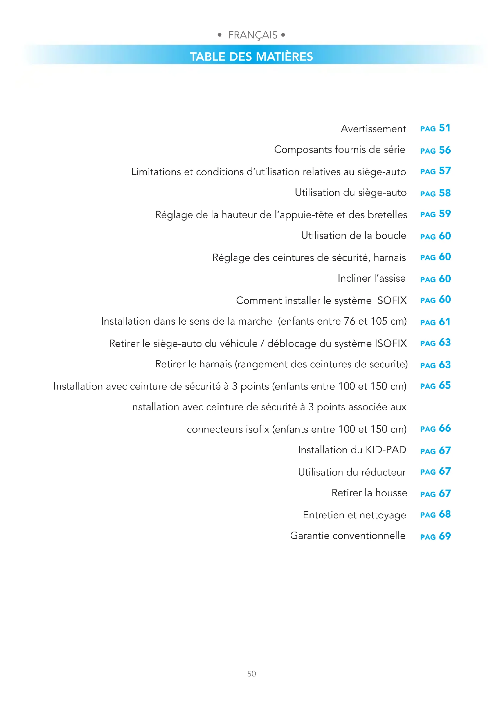 pag 51 pag 56 pag 57 pag 58 pag 59 pag 60 pag 60 pag 60 pag 60 pag 61 pag 63 pag 63 pag 65 pag 66 pag 67 pag 67 pag 67 pag 68 pag 69 Avertissement Composants fournis de série Limitations et conditions d’utilisation relatives au siège-auto Utilisation du siège-auto Réglage de la hauteur de l’appuie-tête et des bretelles Utilisation de la boucle Réglage des ceintures de sécurité, harnais Incliner l’assise Comment installer le système ISOFIX Installation dans le sens de la marche (enfants entre 76 et 105 cm) Retirer le siège-auto du véhicule / déblocage du système ISOFIX Retirer le harnais (rangement des ceintures de securite) Installation avec ceinture de sécurité à 3 points (enfants entre 100 et 150 cm) Installation avec ceinture de sécurité à 3 points associée aux connecteurs isox (enfants entre 100 et 150 cm) Installation du KID-PAD Utilisation du réducteur Retirer la housse Entretien et nettoyage Garantie conventionnelle• FRANÇAIS •