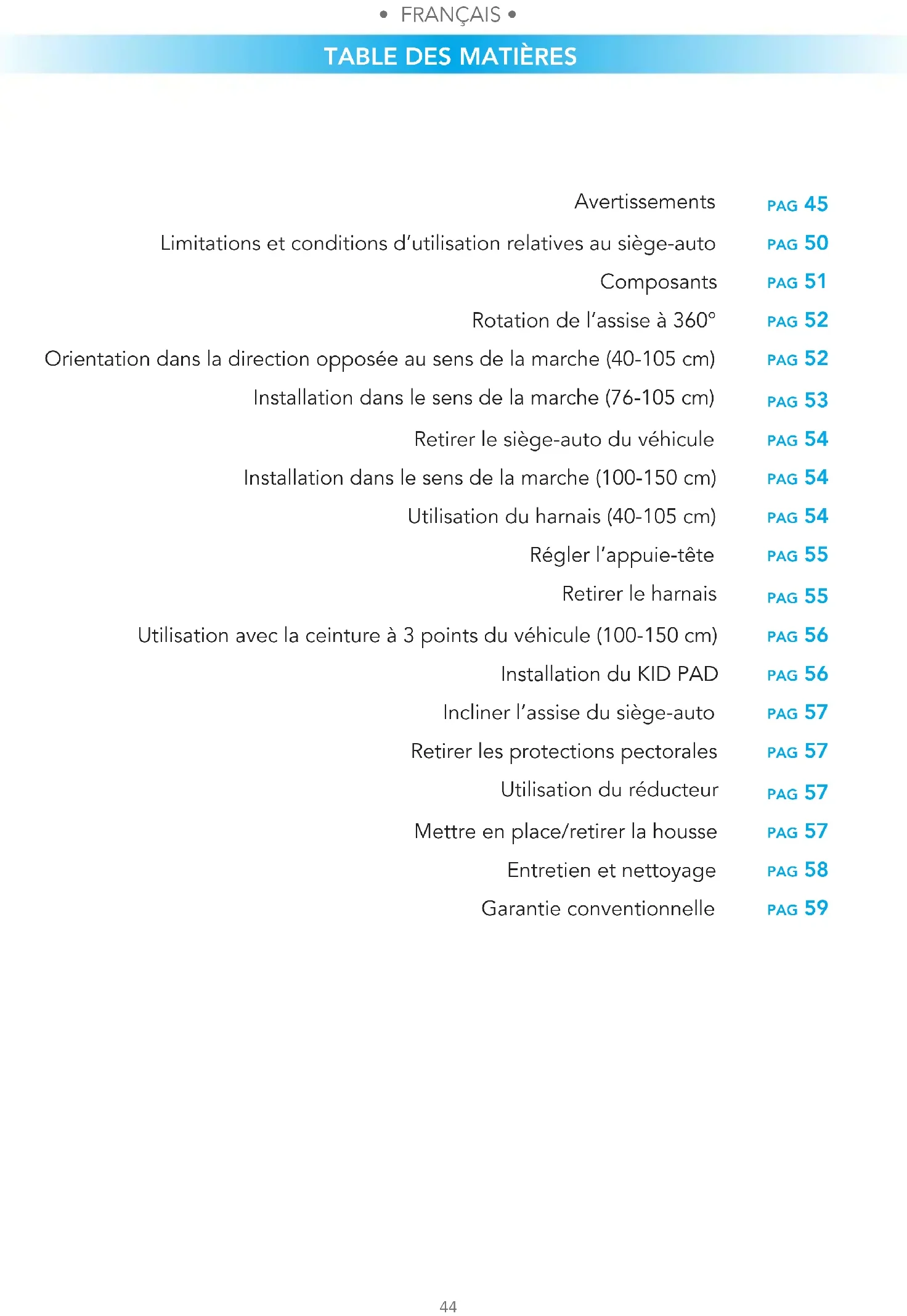 pag 45 pag 50 pag 51 pag 52 pag 52 pag 53 pag 54 pag 54 pag 54 pag 55 pag 55 pag 56 pag 56 pag 57 pag 57 pag 57 pag 57 pag 58 pag 59 Avertissements Limitations et conditions d’utilisation relatives au siège-auto Composants Rotation de l’assise à 360° Orientation dans la direction opposée au sens de la marche (40-105 cm) Installation dans le sens de la marche (76-105 cm) Retirer le siège-auto du véhicule Installation dans le sens de la marche (100-150 cm) Utilisation du harnais (40-105 cm) Régler l’appuie-tête Retirer le harnais Utilisation avec la ceinture à 3 points du véhicule (100-150 cm) Installation du KID PAD Incliner l’assise du siège-auto Retirer les protections pectorales Utilisation du réducteur Mettre en place/retirer la housse Entretien et nettoyage Garantie conventionnelle• FRANÇAIS •