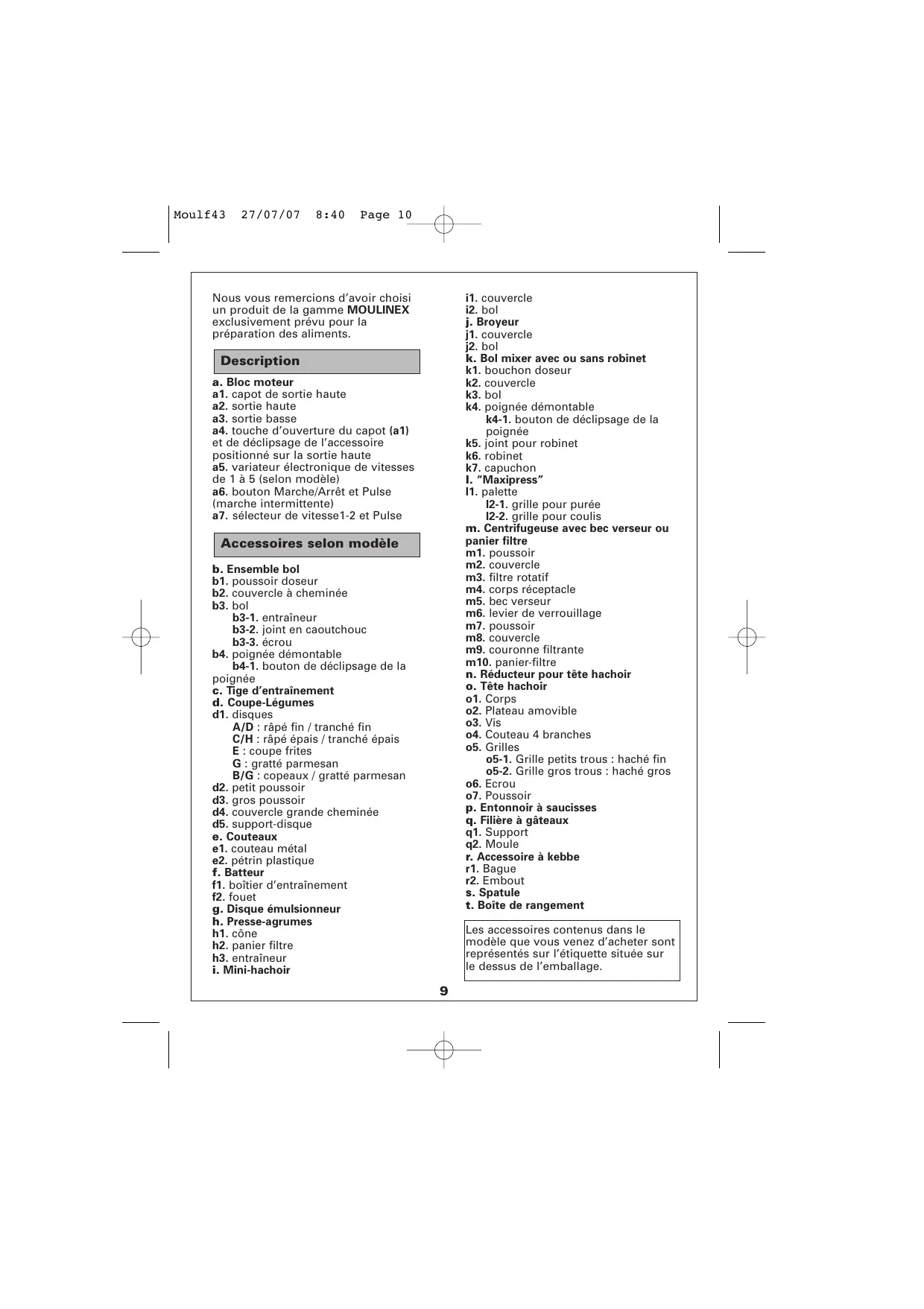 i1. couvercle i2. bol j. Broyeur j1. couvercle j2. bol k. Bol mixer avec ou sans robinet k1. bouchon doseur k2. couvercle k3. bol k4. poignée démontable k4-1. bouton de déclipsage de la poignée k5. joint pour robinet k6. robinet k7. capuchon l. “Maxipress” l1. palette l2-1. grille pour purée l2-2. grille pour coulis m. Centrifugeuse avec bec verseur ou panier filtre m1. poussoir m2. couvercle m3. filtre rotatif m4. corps réceptacle m5. bec verseur m6. levier de verrouillage m7. poussoir m8. couvercle m9. couronne filtrante m10. panier-filtre n. Réducteur pour tête hachoir o. Tête hachoir o1. Corps o2. Plateau amovible o3. Vis o4. Couteau 4 branches o5. Grilles o5-1. Grille petits trous : haché fin o5-2. Grille gros trous : haché gros o6. Ecrou o7. Poussoir p. Entonnoir à saucisses q. Filière à gâteaux q1. Support q2. Moule r. Accessoire à kebbe r1. Bague r2. Embout s. Spatule t. Boîte de rangement