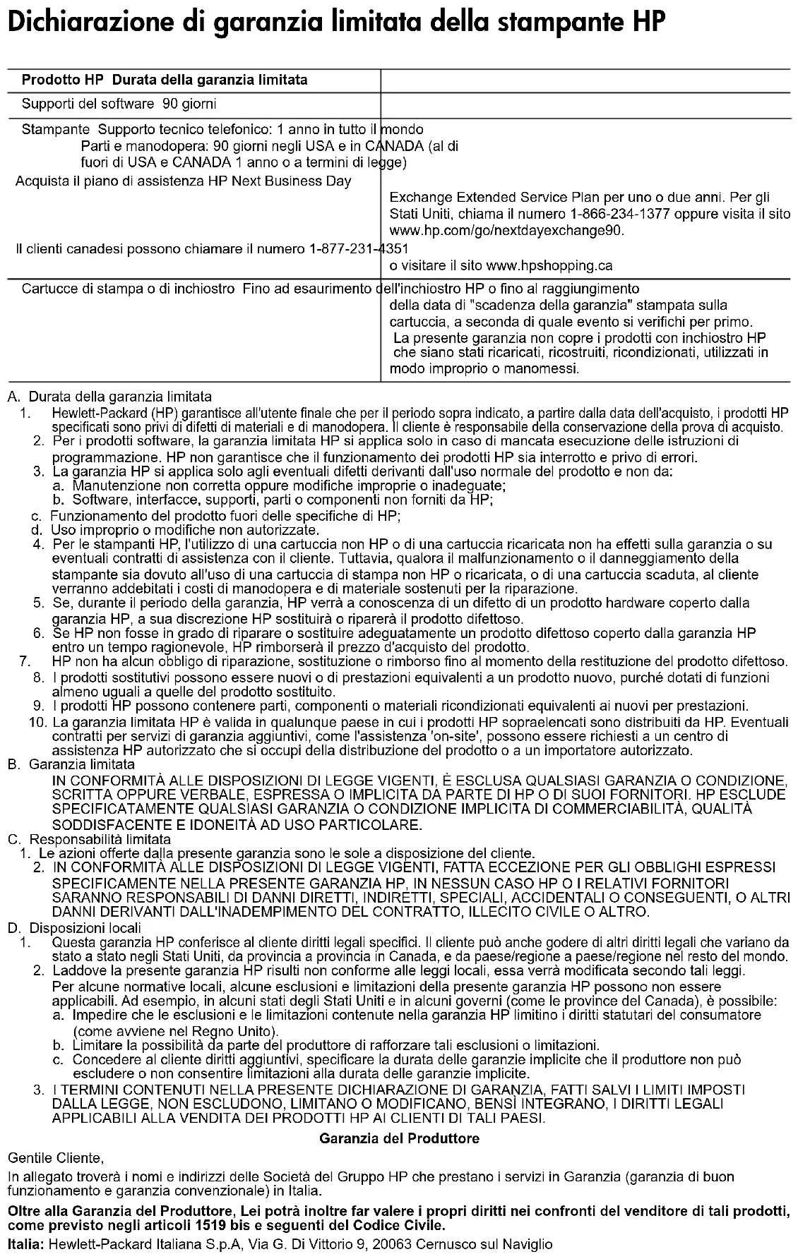 N'EXCLUENT, NE LIMITENT NI NE MODIFIENT LES DROITS STATUTAIRES OBLIGATOIRES APPLICABLES À LA VENTE DES PRODUITS HP AUXDITS CLIENTS, MAIS VIENNENT S'Y AJOUTER. Garantie du fabricant HP Produit HP Durée de la garantie limitée Supports logiciels 90 jours Imprimante Assistance technique par téléphone : 1 an dans le monde entier Pièces et main d'œuvre : 90 jours aux États-Unis et au Canada (hors des États-Unis et du Canada, 1 an ou selon la législation locale) Souscrivez un plan de service HP étendu d'une durée d'un à deux ans avec échange le jour ouvré suivant. Aux États-Unis, appelez le 1-866-234-1377 ou visitez le site www.hp.com/go/nextdayexchange90. Clients du Canada : appelez le 1-877-231-4351 ou visitez le site www.hpshopping.ca Cartouches d'encre Jusqu'à épuisement de l'encre HP ou jusqu'à expiration de la date de garantie imprimée sur la cartouche (selon le cas qui se produira en premier). Cette garantie ne couvre pas les produits utilisant de l'encre HP qui ont été reconditionnés, mal utilisés ou altérés. Cher client, Vous trouverez, ci-après, les coordonnées de l’entité HP responsable de l'exécution de la garantie fabricant relative à votre matériel HP dans votre pays. En vertu de votre contrat d’achat, il se peut que vous disposiez de droits légaux supplémentaires à l’encontre de votre vendeur. Ceux-ci ne sont aucunement affectés par la présente garantie du fabricant HP. En particulier, si vous êtes un consommateur domicilié en France (départements et territoires d’outre-mer (DOM-TOM) inclus dans la limite des textes qui leur sont applicables), le vendeur reste tenu à votre égard des défauts de conformité du bien au contrat et des vices rédhibitoires hhdans les conditions prévues aux articles 1641 à 1649 du Code civil. Code de la consommation : "Art. L. 211-4. - Le vendeur est tenu de livrer un bien conforme au contrat et répond des défauts de conformité existant lors de la délivrance. Il répond également des défauts de conformité résultant de l'emballage, des instructions de montage ou de l'installation lorsque celle-ci a été mise à sa charge par le contrat ou a été réalisée sous sa responsabilité." "Art. L. 211-5. - Pour être conforme au contrat, le bien doit : 1° Etre propre à l'usage habituellement attendu d'un bien semblable et, le cas échéant correspondre à la description donnée par le vendeur et posséder les qualités que celui-ci a présentées à l'acheteur sous forme d'échantillon ou de modèle ; - présenter les qualités qu'un acheteur peut légitimement attendre eu égard aux déclarations publiques faites par le vendeur, par le producteur ou par son représentant, notamment dans la publicité ou l'étiquetage ; 2° Ou présenter les caractéristiques définies d'un commun accord par les parties ou être propre à tout usage spécial recherché par l'acheteur, porté à la connaissance du vendeur et que ce dernier a accepté." "Art. L.211-12. – L’action résultant du défaut de conformité se prescrit par deux ans à compter de la délivrance du bien." Code civil : "Code civil Article 1641 : Le vendeur est tenu de la garantie à raison des défauts cachés de la chose vendue qui la rendent impropre à l’usage auquel on la destine, ou qui diminuent tellement cet usage, que l’acheteur ne l’aurait pas acquise, ou n’en aurait donné qu’un moindre prix, s’il les avait connus. "Code civil Article 1648 : L’action résultant des vices rédhibitoires doit être intentée par l’acquéreur dans un délai de deux ans à compter de la découverte du vice." France : Hewlett-Packard France, SAS, 80, rue Camille Desmoulins, 92788 Issy les Moulineaux Cedex 9 Belgique : Hewlett-Packard Belgium BVBA/SPRL, Hermeslaan 1A, B-1831 Brussels Luxembourg : Hewlett-Packard Luxembourg SCA, Vegacenter, 75, Parc d'Activités Capellen, L-8308 Capellen