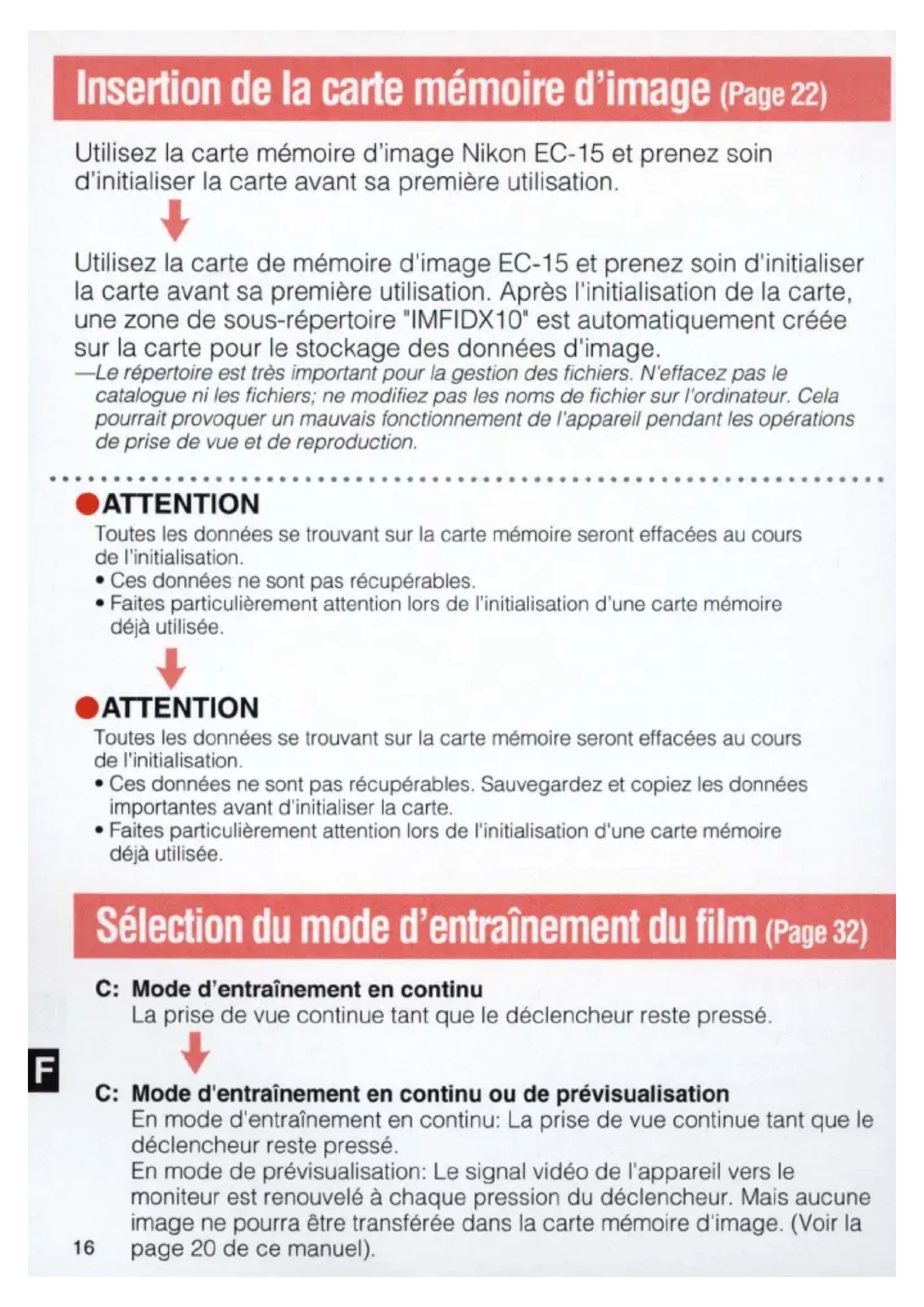 carte memoire d'image (Page 22) Utilisez la carte memoire d'image Nikon EC-15 et prenez soin d'initialiser la carte avant sa premiere ut ili sation.