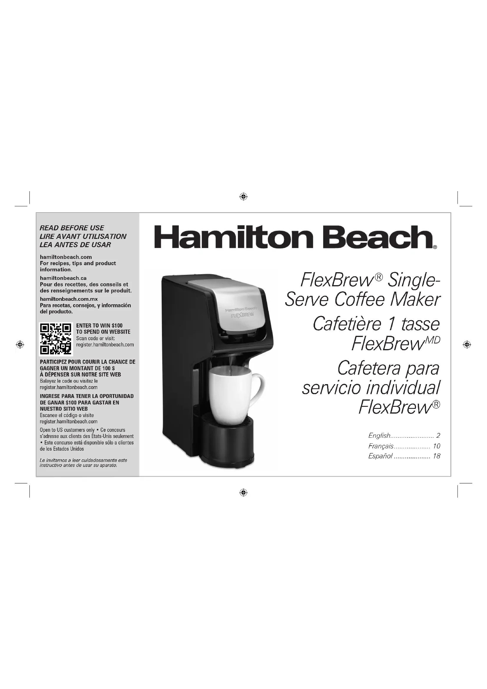 Escanee el código o visite register.hamiltonbeach.com Open to US customers only • Ce concours s’adresse aux clients des États-Unis seulement