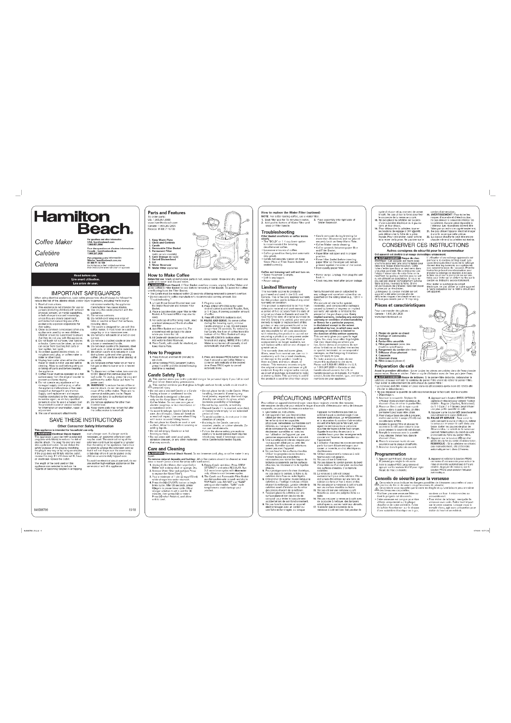 Pour utiliser un appareil électroménager, vous devez toujours prendre des mesures élémentaires de sécurité pour réduire le risque d’incendie, d’électrocution et/ou de blessure corporelle, en particulier les mesures suivantes :1. Lire toutes les instructions.2. Cet appareil n’est pas destiné à être utilisé par des personnes (y compris les enfants) dont les capacités physiques, sensorielles ou mentales sont réduites, ou manquant d’expérience et de connaissance, sauf si elles sont étroitement surveillées et instruites sur l’utilisation de l’appareil par une personne responsable de leur sécurité.3. Une surveillance étroite est requise pour tout appareil utilisé par ou près des enfants. Surveiller que les enfants ne jouent pas avec l’appareil. 4. Ne pas toucher les surfaces chaudes. Utiliser les poignées ou les boutons. Prendre toutes les précautions nécessaires pour éviter les risques de brûlures occasionnés par les surfaces chaudes, les déversements de liquides chauds.5. Pour protéger contre le choc électrique, ne pas placer le cordon, la fiche ou la cafetière dans l’eau ou autre liquide.6. Débrancher de la prise murale lorsque la cafetière ou l’horloge n’est pas utilisée et avant le nettoyage. Laisser refroidir la cafetière avant d’installer ou de retirer des pièces et avant de la nettoyer.7. Toujours placer la cafetière sur une surface plane et loin des bords de comptoir pour éviter le basculement accidentel lors de son fonctionnement.8. Ne pas faire fonctionner un appareil électroménager avec un cordon ou une fiche endommagée, ou lorsque l’appareil ne fonctionne pas bien ou a été échappé ou endommagé d’une manière quelconque. Le remplacement et la réparation du cordon d’alimentation doivent être faits par le fabricant, son agent de service ou toute personne qualifiée de façon à éviter tout danger. Appeler le numéro de service à la clientèle fourni pour des renseignements concernant l’examen, la réparation ou l’ajustement. L’utilisation d’accessoires non recommandés par le fabricant d’électroménagers peut causer un incendie, un choc électrique ou des blessures.10. Utiliser uniquement la verseuse à café fournie avec cet appareil.11. Ne pas utiliser à l’extérieur.12. Ne pas laisser le cordon pendre du bord d’une table ou d’un comptoir, ou toucher des surfaces chaudes, y compris la cuisinière. La verseuse à café est conçue exclusivement pour cette cafetière. Elle ne doit jamais être utilisée sur une table de cuisson ou dans un four à micro-ondes.14. Ne pas placer la verseuse à café chaude sur une surface mouillée ou froide. 15. Ne pas utiliser une verseuse à café fissurée ou avec une poignée lâche ou usée.16. Ne pas nettoyer la verseuse à café avec de la poudre à nettoyer, des tampons métalliques ou autres matériaux abrasifs.17. S’assurer que le couvercle de la verseuse à café est bien fixé pendant le Plaque de garde au chaud Horloge et commandes Verseuse Panier-filtre amovible Filtre permanent (avec des modèles spécifiques) Rangement du cordon (derrière) Diffuseur d’eau pivotant Couvercle Réservoir d’eau Filtre à eau (optionnel)For questions and other information: USA: hamiltonbeach.com 1.800.851.8900Pour des questions et d’autres informations : Canada : hamiltonbeach.ca 1.800.267.2826Para preguntas y otra información: México: hamiltonbeach.com.mx 01 800 71 16 100 Le invitamos a leer cuidadosamente este instructivo antes de usar su aparato. Pièces et caractéristiques Pour commander des pièces : Canada : 1.800.267.2826www.hamiltonbeach.cacycle d’infusion et au moment de verser le café. Ne pas utiliser la force pour fixer le couvercle de la verseuse à café.18. Ne pas placer la cafetière sur ou près d’une cuisinière électrique ou à gaz ou dans un four chaud.19. Pour débrancher la cafetière, tourner les boutons de réglage à OFF ( /arrêt) puis débrancher la fiche de la prise murale. Pour débrancher, saisir la fiche et la retirer de la prise. Ne pas tirer sur le cordon d’alimentation.20. AVERTISSEMENT ! Pour éviter les risques d’incendie et d’électrocution, ne pas enlever le couvercle inférieur de la cafetière. Aucune pièce réparable à l’intérieur. Les réparations doivent être faites par un technicien agréé seulement.21. Ne pas utiliser l’appareil électroménager à une fin autre que celle prévue.22. La plaque chauffante peut être encore chaude même si la cafetière est éteinte.