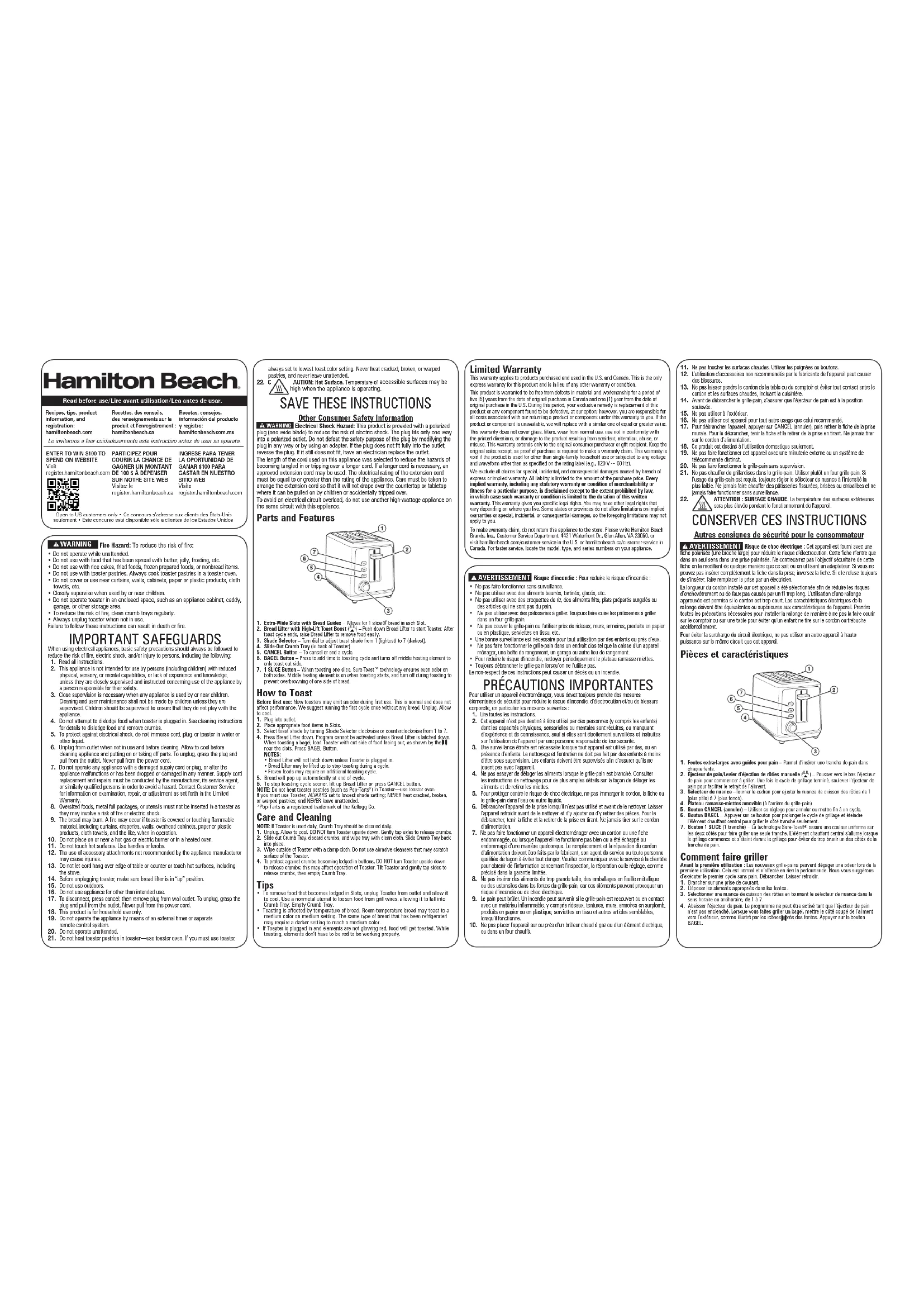 - Pour déloger les aliments coincés dans les fentes, débrancher le grille-pain de la prise de courant et laisser refroidir. Utiliser un ustensile non métallique pour déloger l’aliment des éléments et le laisser tomber dans le plateau ramasse-miettes. Vider le plateau ramasse-miettes.• Le grillage est affecté par la température du pain. Le pain à la température ambiante peut griller à une nuance moyenne au réglage moyen. Le même genre de pain réfrigéré peut nécessiter un réglage plus foncé pour atteindre une nuance moyenne.• Si le grille-pain est branché et que les éléments ne deviennent pas rouges, les aliments grilleront. Pendant le grillage, les éléments ne devenant pas rouges n’indiquent pas un mauvais fonctionnement. Garantie limitée Cette garantie s’applique aux produits achetés et utilisées aux É.-U. et au Canada. C’est la seule garantie expresse pour ce produit et est en lieu et place de tout autre garantie ou condition. Ce produit est garanti contre tout défaut de matériaux et de main-d’oeuvre pour une période de cinq (5) ans à compter de la date d’achat d’origine au Canada et un (1) an à compter de la date d’achat d’origine aux É.-U. Au cours de cette période, votre recours exclusif se limitera au remplacement de ce produit ou tout autre composant défectueux, à notre discrétion. Cependant, vous êtes responsables des frais associés au retour du produit ou d’un composant en vertu de la présente garantie. Si le produit ou le composant est non disponible, nous le remplacerons avec un article similaire de valeur égale ou supérieure.Cette garantie ne couvre pas le verre, les filtres, l’usure d’un usage normal, l’utilisation non conforme aux directives imprimées, ou des dommages au produit résultant d’un accident, modification, utilisation abusive ou incorrecte. Cette garantie s’applique seulement à l’acheteur original ou à la personne l’ayant reçu en cadeau. La présentation du reçu de vente d’origine comme preuve d’achat est nécessaire pour faire une réclamation au titre de cette garantie. Cette garantie s’annule si le produit est utilisé autrement que par une famille ou si l’appareil est soumis à toute tension ou forme d’onde différente des caractéristiques nominales précisées sur l’étiquette (par ex. : 120 V ~ 60 Hz).Nous excluons toutes les réclamations au titre de cette garantie pour les dommages spéciaux, consécutifs et indirects causés par la violation de garantie expresse ou implicite. Toute responsabilité est limitée au prix d’achat. Chaque garantie implicite, y compris toute garantie ou condition de qualité marchande ou d’adéquation à un usage particulier, est exonérée, sauf dans la mesure interdite par la loi, auquel cas la garantie ou condition est limitée à la durée de cette garantie écrite. Cette garantie vous donne des droits légaux précis. Vous pouvez avoir d’autres droits qui varient selon l’endroit où vous habitez. Certaines provinces ne permettent pas les limitations sur les garanties implicites ou les dommages spéciaux ou indirects de telle sorte que les limitations ci-dessus ne s’appliquent peut-être pas à votre cas.Pour faire une réclamation au titre de la garantie, veuillez ne pas retourner cet appareil au magasin. Veuillez nous écrire à Hamilton Beach Brands, Inc., Customer Service Department, 4421 Waterfront Dr., Glen Allen, VA 23060, ou visiter le site hamiltonbeach.com/customer-service aux États-Unis ou hamiltonbeach.ca/customer-service au Canada. Pour obtenir un service plus rapide, veuillez repérer les numéros de modèle, de type et de séries sur votre appareil.w ADVERTENCIA Riesgo de incendio: Para reducir el riesgo de incendio: