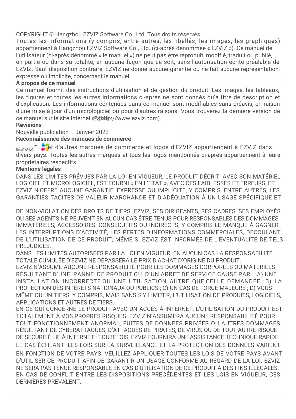 COPYRIGHT © Hangzhou EZVIZ Software Co., Ltd. Tous droits réservés. Toutes les informations (y compris, entre autres, les libellés, les images, les graphiques) appartiennent à Hangzhou EZVIZ Software Co., Ltd. (ci-après dénommée «EZVIZ»). Ce manuel de l’utilisateur (ci-après dénommé «le manuel») ne peut pas être reproduit, modifié, traduit ou publié, en partie ou dans sa totalité, en aucune façon que ce soit, sans l’autorisation écrite préalable de EZVIZ. Sauf disposition contraire, EZVIZ ne donne aucune garantie ou ne fait aucune représentation, expresse ou implicite, concernant le manuel. À propos de ce manuel Ce manuel fournit des instructions d’utilisation et de gestion du produit. Les images, les tableaux, les figures et toutes les autres informations ci-après ne sont donnés qu’à titre de description et d’explication. Les informations contenues dans ce manuel sont modifiables sans préavis, en raison d’une mise à jour d’un micrologiciel ou pour d’autres raisons. Vous trouverez la dernière version de ce manuel sur le site Internet ™ (http://www.ezviz.com). Révisions Nouvelle publication – Janvier2023 Reconnaissance des marques de commerce ™, ™ et d’autres marques de commerce et logos d’EZVIZ appartiennent à EZVIZ dans divers pays. Toutes les autres marques et tous les logos mentionnés ci-après appartiennent à leurs propriétaires respectifs. Mentions légales DANS LES LIMITES PRÉVUES PAR LA LOI EN VIGUEUR, LE PRODUIT DÉCRIT, AVEC SON MATÉRIEL, LOGICIEL ET MICROLOGICIEL, EST FOURNI «EN L’ÉTAT», AVEC CES FAIBLESSES ET ERREURS, ET EZVIZ N’OFFRE AUCUNE GARANTIE, EXPRESSE OU IMPLICITE, Y COMPRIS, ENTRE AUTRES, LES GARANTIES TACITES DE VALEUR MARCHANDE ET D’ADÉQUATION À UN USAGE SPÉCIFIQUE ET