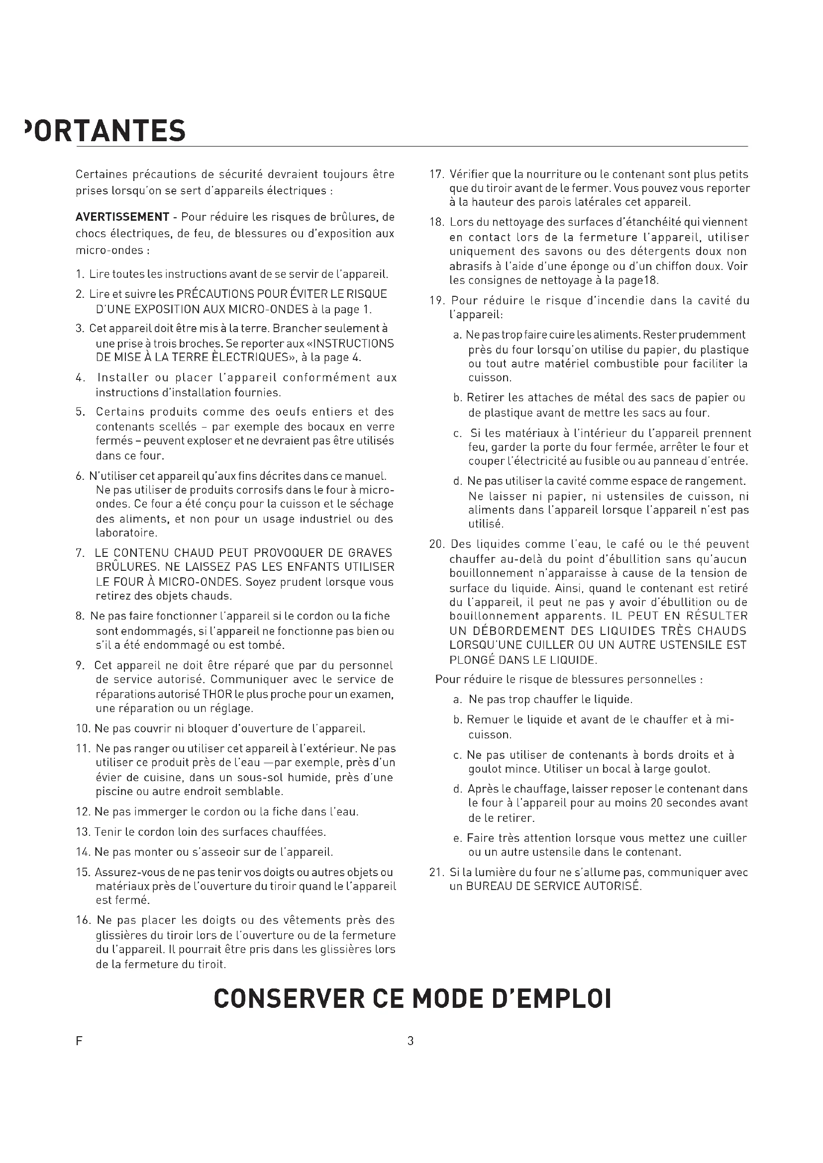 - Le papier d’aluminium doit être à au moins 2,5 cm des parois du four. Pour toute question concernant les ustensiles ou la manière de couvrir les aliments, consulter un bon livre de cuisine spécialisé en micro-ondes ou suivre les conseils de la recette. Accessoires De nombreux accessoires pour four à micro-ondes sont offerts sur le marché. Évaluer soigneusement ses besoins avant d’en faire l’acquisition. Un thermomètre pour micro- ondes permettra de vérifier la cuisson et de s’assurer que les aliments sont cuits à point et à la bonne température. THOR n’est pas responsable des dommages au four résultant de l’utilisation d’accessoires.