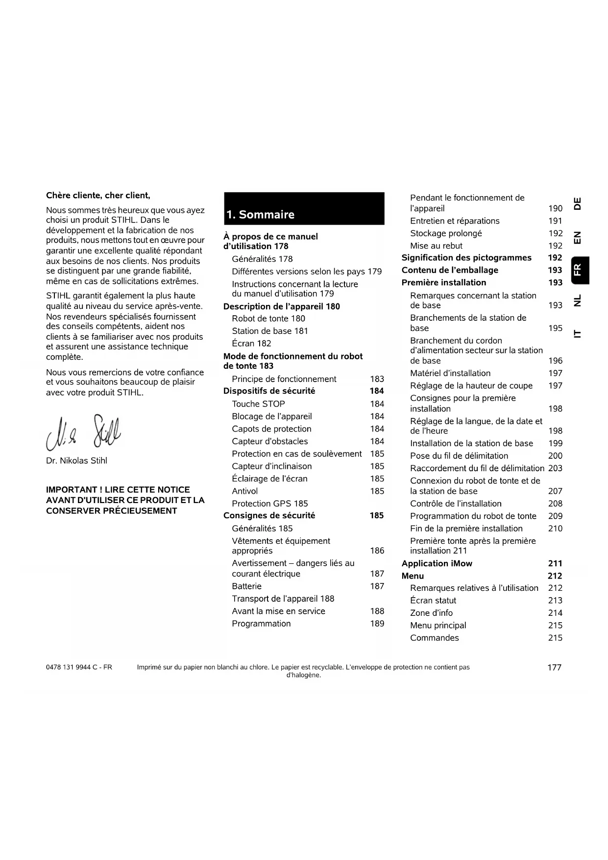 DEENNLIT FR 0478 131 9944 C - FR Chère cliente, cher client, Nous sommes très heureux que vous ayez choisi un produit STIHL. Dans le développement et la fabrication de nos produits, nous mettons tout en œuvre pour garantir une excellente qualité répondant aux besoins de nos clients. Nos produits se distinguent par une grande fiabilité, même en cas de sollicitations extrêmes. STIHL garantit également la plus haute qualité au niveau du service après-vente. Nos revendeurs spécialisés fournissent des conseils compétents, aident nos clients à se familiariser avec nos produits et assurent une assistance technique complète. Nous vous remercions de votre confiance et vous souhaitons beaucoup de plaisir avec votre produit STIHL. Dr. Nikolas Stihl