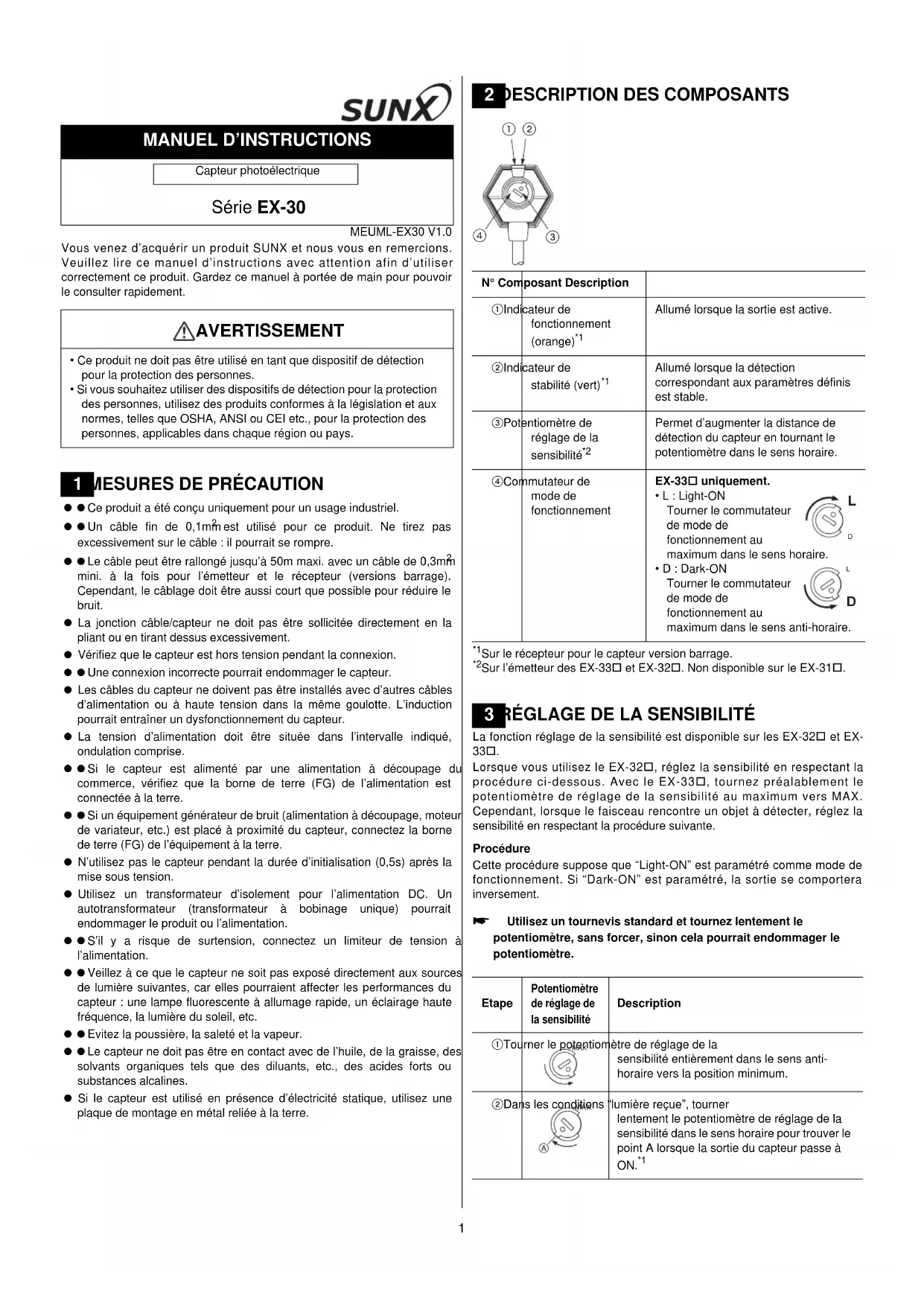 MEUML-EX30 V1.0 Vous venez d’acquérir un produit SUNX et nous vous en remercions. Veuillez lire ce manuel d’instructions avec attention afin d’utiliser correctement ce produit. Gardez ce manuel à portée de main pour pouvoir le consulter rapidement. Ce produit a été conçu uniquement pour un usage industriel. Un câble fin de 0,1mm