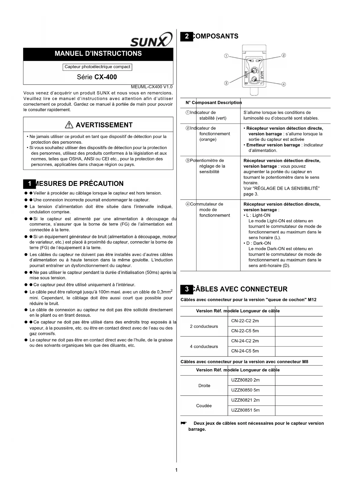 CX-491 (NPN) *2, CX-421 (NPN) *2, CX-422 (NPN) *2, CX-423 (NPN) *2, CX-411-P (PNP) *2, CX-491-P (PNP) *2, CX-421-P (PNP) *2, CX-422-P (PNP) *2, CX-423-P (PNP) *2,1 MEUML-CX400 V1.0 Vous venez d’acquérir un produit SUNX et nous vous en remercions. Veuillez lire ce manuel d’instructions avec attention afin d’utiliser correctement ce produit. Gardez ce manuel à portée de main pour pouvoir le consulter rapidement. Veiller à procéder au câblage lorsque le capteur est hors tension. Une connexion incorrecte pourrait endommager le capteur. La tension d’alimentation doit être située dans l’intervalle indiqué, ondulation comprise. Si le capteur est alimenté par une alimentation à découpage du commerce, s’assurer que la borne de terre (FG) de l’alimentation est connectée à la terre. Si un équipement générateur de bruit (alimentation à découpage, moteur de variateur, etc.) est placé à proximité du capteur, connecter la borne de terre (FG) de l’équipement à la terre. Les câbles du capteur ne doivent pas être installés avec d’autres câbles d’alimentation ou à haute tension dans la même goulotte. L’induction pourrait entraîner un dysfonctionnement du capteur. Ne pas utiliser le capteur pendant la durée d’initialisation (50ms) après la mise sous tension. Ce capteur peut être utilisé uniquement à l’intérieur. Le câble peut être rallongé jusqu’à 100m maxi. avec un câble de 0,3mm