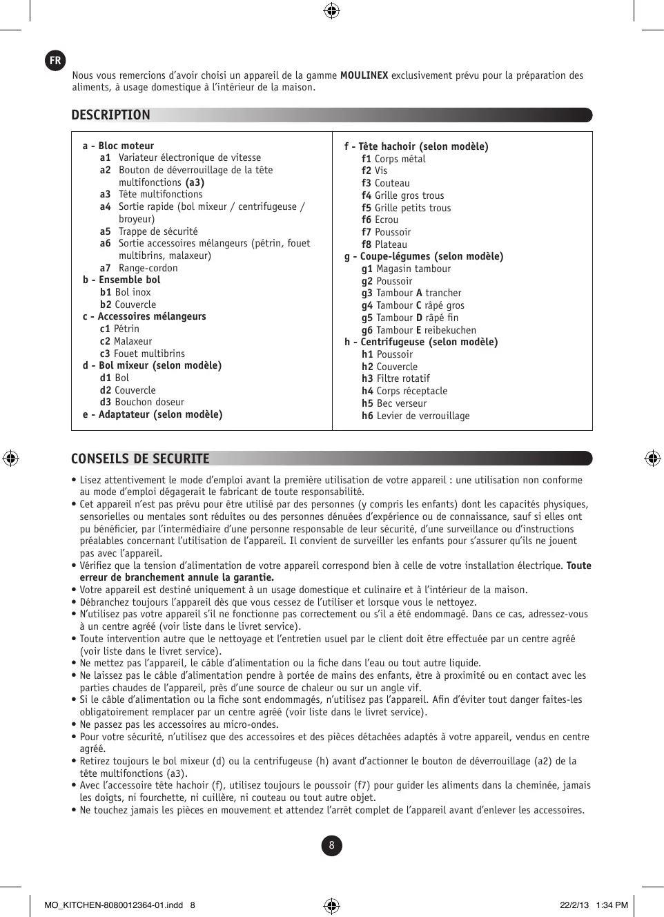 • Votre appareil est destiné uniquement à un usage domestique et culinaire et à l’intérieur de la maison. • Débranchez toujours l’appareil dès que vous cessez de l’utiliser et lorsque vous le nettoyez. • N’utilisez pas votre appareil s’il ne fonctionne pas correctement ou s’il a été endommagé. Dans ce cas, adressez-vous à un centre agréé (voir liste dans le livret service). • Toute intervention autre que le nettoyage et l’entretien usuel par le client doit être effectuée par un centre agréé (voir liste dans le livret service). • Ne mettez pas l’appareil, le câble d’alimentation ou la fiche dans l’eau ou tout autre liquide. • Ne laissez pas le câble d’alimentation pendre à portée de mains des enfants, être à proximité ou en contact avec les parties chaudes de l’appareil, près d’une source de chaleur ou sur un angle vif. • Si le câble d’alimentation ou la fiche sont endommagés, n’utilisez pas l’appareil. Afin d’éviter tout danger faites-les obligatoirement remplacer par un centre agréé (voir liste dans le livret service). • Ne passez pas les accessoires au micro-ondes. • Pour votre sécurité, n’utilisez que des accessoires et des pièces détachées adaptés à votre appareil, vendus en centre agréé. • Retirez toujours le bol mixeur (d) ou la centrifugeuse (h) avant d’actionner le bouton de déverrouillage (a2) de la tête multifonctions (a3). • Avec l’accessoire tête hachoir (f), utilisez toujours le poussoir (f7) pour guider les aliments dans la cheminée, jamais les doigts, ni fourchette, ni cuillère, ni couteau ou tout autre objet. • Ne touchez jamais les pièces en mouvement et attendez l’arrêt complet de l’appareil avant d’enlever les accessoires.