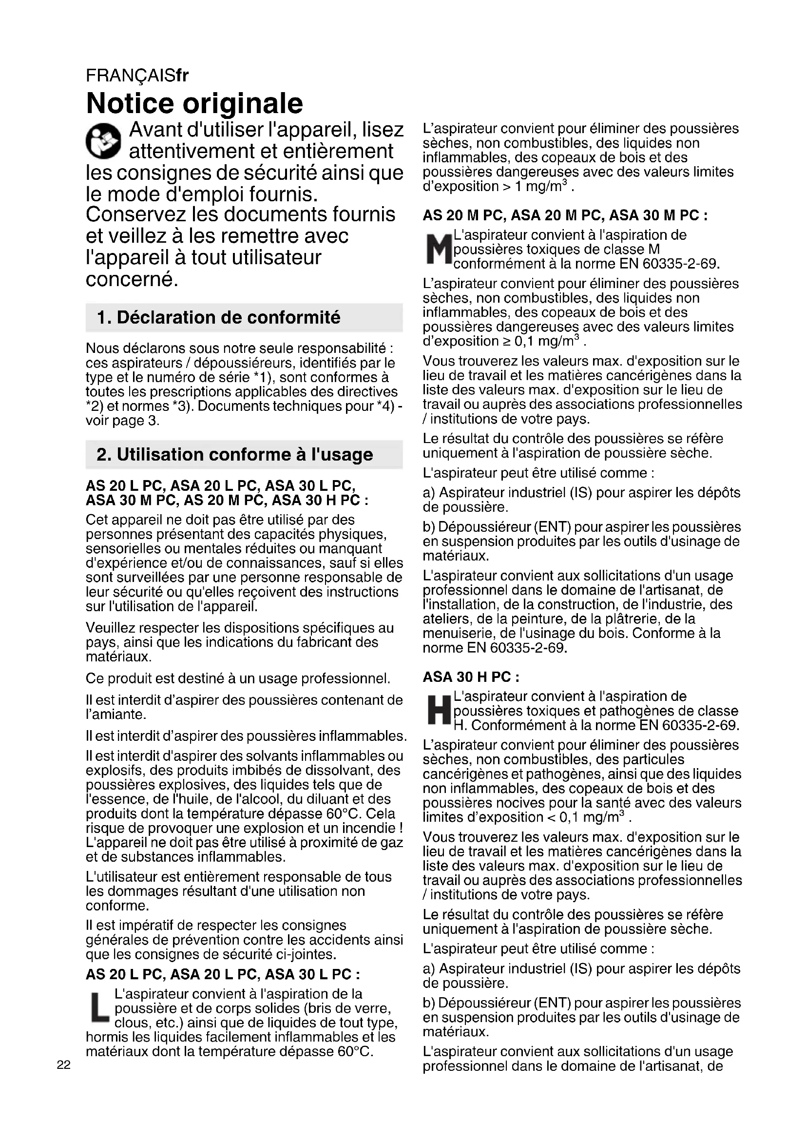 Notice originale Avant d'utiliser l'appareil, lisez attentivement et entièrement les consignes de sécurité ainsi que le mode d'emploi fournis. Conservez les documents fournis et veillez à les remettre avec l'appareil à tout utilisateur concerné. Nous déclarons sous notre seule responsabilité : ces aspirateurs / dépoussiéreurs, identifiés par le type et le numéro de série *1), sont conformes à toutes les prescriptions applicables des directives *2) et normes *3). Documents techniques pour *4) - voir page 3. AS 20 L PC, ASA 20 L PC, ASA 30 L PC, ASA 30 M PC, AS 20 M PC, ASA 30 H PC : Cet appareil ne doit pas être utilisé par des personnes présentant des capacités physiques, sensorielles ou mentales réduites ou manquant d'expérience et/ou de connaissances, sauf si elles sont surveillées par une personne responsable de leur sécurité ou qu'elles reçoivent des instructions sur l'utilisation de l'appareil. Veuillez respecter les dispositions spécifiques au pays, ainsi que les indications du fabricant des matériaux. Ce produit est destiné à un usage professionnel. Il est interdit d’aspirer des poussières contenant de l’amiante. Il est interdit d’aspirer des poussières inflammables. Il est interdit d'aspirer des solvants inflammables ou explosifs, des produits imbibés de dissolvant, des poussières explosives, des liquides tels que de l'essence, de l'huile, de l'alcool, du diluant et des produits dont la température dépasse 60°C. Cela risque de provoquer une explosion et un incendie ! L'appareil ne doit pas être utilisé à proximité de gaz et de substances inflammables. L'utilisateur est entièrement responsable de tous les dommages résultant d'une utilisation non conforme. Il est impératif de respecter les consignes générales de prévention contre les accidents ainsi que les consignes de sécurité ci-jointes. AS 20 L PC, ASA 20 L PC, ASA 30 L PC : L'aspirateur convient à l'aspiration de la poussière et de corps solides (bris de verre, clous, etc.) ainsi que de liquides de tout type, hormis les liquides facilement inflammables et les matériaux dont la température dépasse 60°C. L’aspirateur convient pour éliminer des poussières sèches, non combustibles, des liquides non inflammables, des copeaux de bois et des poussières dangereuses avec des valeurs limites d’exposition > 1 mg/m³ . AS 20 M PC, ASA 20 M PC, ASA 30 M PC : L'aspirateur convient à l'aspiration de poussières toxiques de classe M conformément à la norme EN 60335-2-69. L’aspirateur convient pour éliminer des poussières sèches, non combustibles, des liquides non inflammables, des copeaux de bois et des poussières dangereuses avec des valeurs limites d’exposition ≥ 0,1 mg/m³ . Vous trouverez les valeurs max. d'exposition sur le lieu de travail et les matières cancérigènes dans la liste des valeurs max. d'exposition sur le lieu de travail ou auprès des associations professionnelles / institutions de votre pays. Le résultat du contrôle des poussières se réfère uniquement à l'aspiration de poussière sèche. L'aspirateur peut être utilisé comme : a) Aspirateur industriel (IS) pour aspirer les dépôts de poussière. b) Dépoussiéreur (ENT) pour aspirer les poussières en suspension produites par les outils d'usinage de matériaux. L'aspirateur convient aux sollicitations d'un usage professionnel dans le domaine de l'artisanat, de l'installation, de la construction, de l'industrie, des ateliers, de la peinture, de la plâtrerie, de la menuiserie, de l'usinage du bois. Conforme à la norme EN 60335-2-69. ASA 30 H PC : L'aspirateur convient à l'aspiration de poussières toxiques et pathogènes de classe H. Conformément à la norme EN 60335-2-69. L’aspirateur convient pour éliminer des poussières sèches, non combustibles, des particules cancérigènes et pathogènes, ainsi que des liquides non inflammables, des copeaux de bois et des poussières nocives pour la santé avec des valeurs limites d’exposition < 0,1 mg/m³ . Vous trouverez les valeurs max. d'exposition sur le lieu de travail et les matières cancérigènes dans la liste des valeurs max. d'exposition sur le lieu de travail ou auprès des associations professionnelles / institutions de votre pays. Le résultat du contrôle des poussières se réfère uniquement à l'aspiration de poussière sèche. L'aspirateur peut être utilisé comme : a) Aspirateur industriel (IS) pour aspirer les dépôts de poussière. b) Dépoussiéreur (ENT) pour aspirer les poussières en suspension produites par les outils d'usinage de matériaux. L'aspirateur convient aux sollicitations d'un usage professionnel dans le domaine de l'artisanat, de