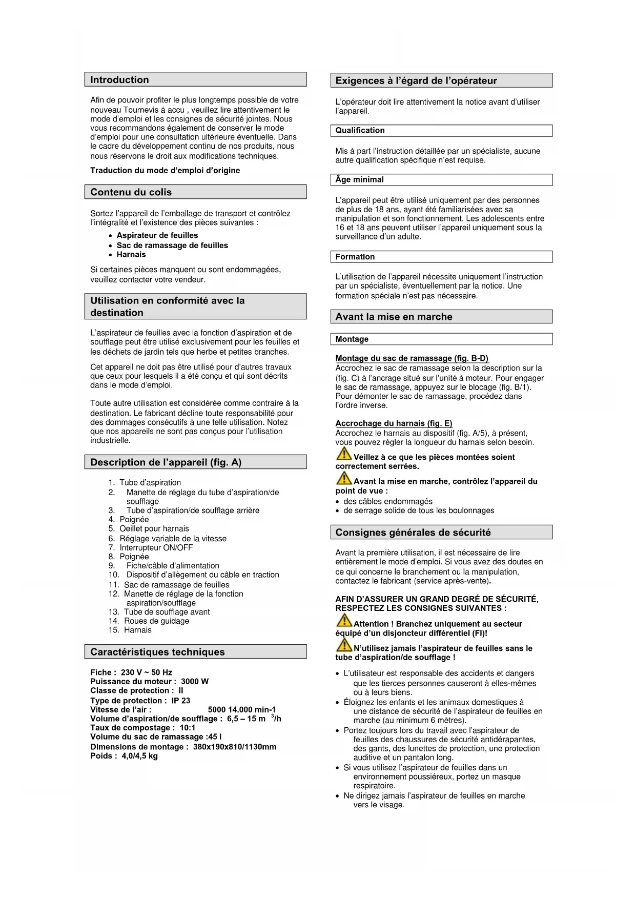 - de serrage solide de tous les boulonnages Consignes générales de sécurité Avant la première utilisation, il est nécessaire de lire entièrement le mode d’emploi. Si vous avez des doutes en ce qui concerne le branchement ou la manipulation, contactez le fabricant (service après-vente). AFIN D’ASSURER UN GRAND DEGRÉ DE SÉCURITÉ, RESPECTEZ LES CONSIGNES SUIVANTES : Attention ! Branchez uniquement au secteur équipé d’un disjoncteur différentiel (FI)! N’utilisez jamais l’aspirateur de feuilles sans le tube d’aspiration/de soufflage !
