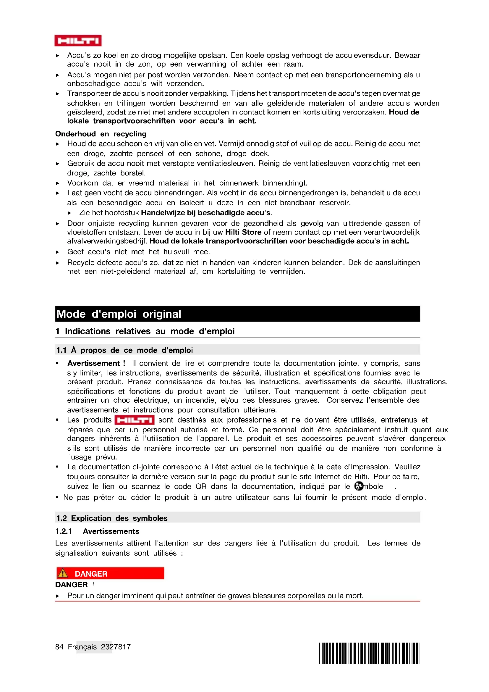 Ne pas jeter les appareils électriques, électroniques et accus dans les ordures ménagères ! 14 Garantie constructeur ▶ En cas de questions sur les conditions de garantie, veuillez vous adresser à votre partenaire Hilti local.110 Français 2327817 *2327817* 15 Informations complémentaires Les accessoires, les produits système et d'autres informations sur votre produit sont accessibles ici.