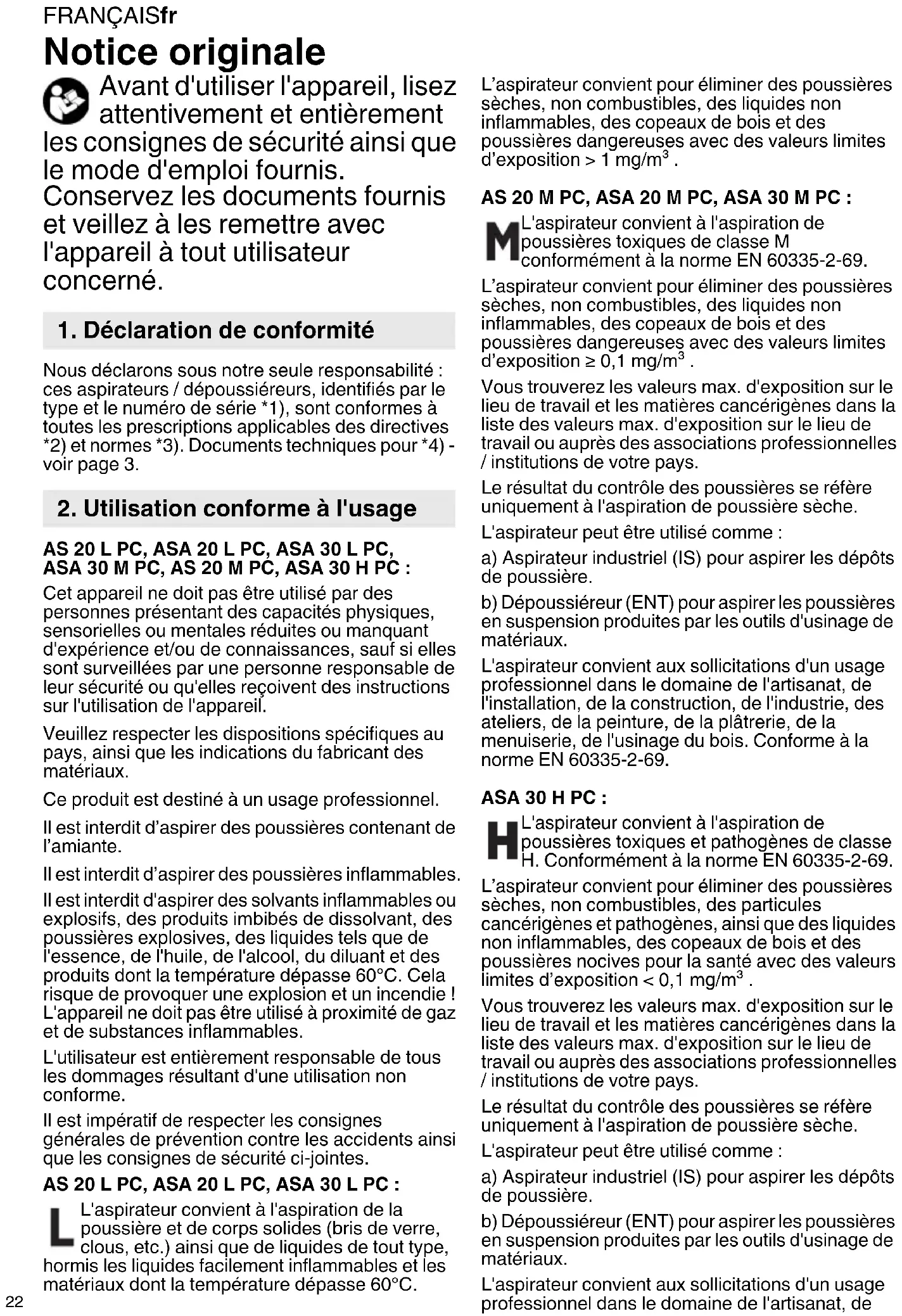 Notice originale Avant d'utiliser l'appareil, lisez attentivement et entièrement les consignes de sécurité ainsi que le mode d'emploi fournis. Conservez les documents fournis et veillez à les remettre avec l'appareil à tout utilisateur concerné. Nous déclarons sous notre seule responsabilité : ces aspirateurs / dépoussiéreurs, identifiés par le type et le numéro de série *1), sont conformes à toutes les prescriptions applicables des directives *2) et normes *3). Documents techniques pour *4) - voir page 3. AS 20 L PC, ASA 20 L PC, ASA 30 L PC, ASA 30 M PC, AS 20 M PC, ASA 30 H PC : Cet appareil ne doit pas être utilisé par des personnes présentant des capacités physiques, sensorielles ou mentales réduites ou manquant d'expérience et/ou de connaissances, sauf si elles sont surveillées par une personne responsable de leur sécurité ou qu'elles reçoivent des instructions sur l'utilisation de l'appareil. Veuillez respecter les dispositions spécifiques au pays, ainsi que les indications du fabricant des matériaux. Ce produit est destiné à un usage professionnel. Il est interdit d’aspirer des poussières contenant de l’amiante. Il est interdit d’aspirer des poussières inflammables. Il est interdit d'aspirer des solvants inflammables ou explosifs, des produits imbibés de dissolvant, des poussières explosives, des liquides tels que de l'essence, de l'huile, de l'alcool, du diluant et des produits dont la température dépasse 60°C. Cela risque de provoquer une explosion et un incendie ! L'appareil ne doit pas être utilisé à proximité de gaz et de substances inflammables. L'utilisateur est entièrement responsable de tous les dommages résultant d'une utilisation non conforme. Il est impératif de respecter les consignes générales de prévention contre les accidents ainsi que les consignes de sécurité ci-jointes. AS 20 L PC, ASA 20 L PC, ASA 30 L PC : L'aspirateur convient à l'aspiration de la poussière et de corps solides (bris de verre, clous, etc.) ainsi que de liquides de tout type, hormis les liquides facilement inflammables et les matériaux dont la température dépasse 60°C. L’aspirateur convient pour éliminer des poussières sèches, non combustibles, des liquides non inflammables, des copeaux de bois et des poussières dangereuses avec des valeurs limites d’exposition > 1 mg/m³ . AS 20 M PC, ASA 20 M PC, ASA 30 M PC : L'aspirateur convient à l'aspiration de poussières toxiques de classe M conformément à la norme EN 60335-2-69. L’aspirateur convient pour éliminer des poussières sèches, non combustibles, des liquides non inflammables, des copeaux de bois et des poussières dangereuses avec des valeurs limites d’exposition ≥ 0,1 mg/m³ . Vous trouverez les valeurs max. d'exposition sur le lieu de travail et les matières cancérigènes dans la liste des valeurs max. d'exposition sur le lieu de travail ou auprès des associations professionnelles / institutions de votre pays. Le résultat du contrôle des poussières se réfère uniquement à l'aspiration de poussière sèche. L'aspirateur peut être utilisé comme : a) Aspirateur industriel (IS) pour aspirer les dépôts de poussière. b) Dépoussiéreur (ENT) pour aspirer les poussières en suspension produites par les outils d'usinage de matériaux. L'aspirateur convient aux sollicitations d'un usage professionnel dans le domaine de l'artisanat, de l'installation, de la construction, de l'industrie, des ateliers, de la peinture, de la plâtrerie, de la menuiserie, de l'usinage du bois. Conforme à la norme EN 60335-2-69. ASA 30 H PC : L'aspirateur convient à l'aspiration de poussières toxiques et pathogènes de classe H. Conformément à la norme EN 60335-2-69. L’aspirateur convient pour éliminer des poussières sèches, non combustibles, des particules cancérigènes et pathogènes, ainsi que des liquides non inflammables, des copeaux de bois et des poussières nocives pour la santé avec des valeurs limites d’exposition < 0,1 mg/m³ . Vous trouverez les valeurs max. d'exposition sur le lieu de travail et les matières cancérigènes dans la liste des valeurs max. d'exposition sur le lieu de travail ou auprès des associations professionnelles / institutions de votre pays. Le résultat du contrôle des poussières se réfère uniquement à l'aspiration de poussière sèche. L'aspirateur peut être utilisé comme : a) Aspirateur industriel (IS) pour aspirer les dépôts de poussière. b) Dépoussiéreur (ENT) pour aspirer les poussières en suspension produites par les outils d'usinage de matériaux. L'aspirateur convient aux sollicitations d'un usage professionnel dans le domaine de l'artisanat, de