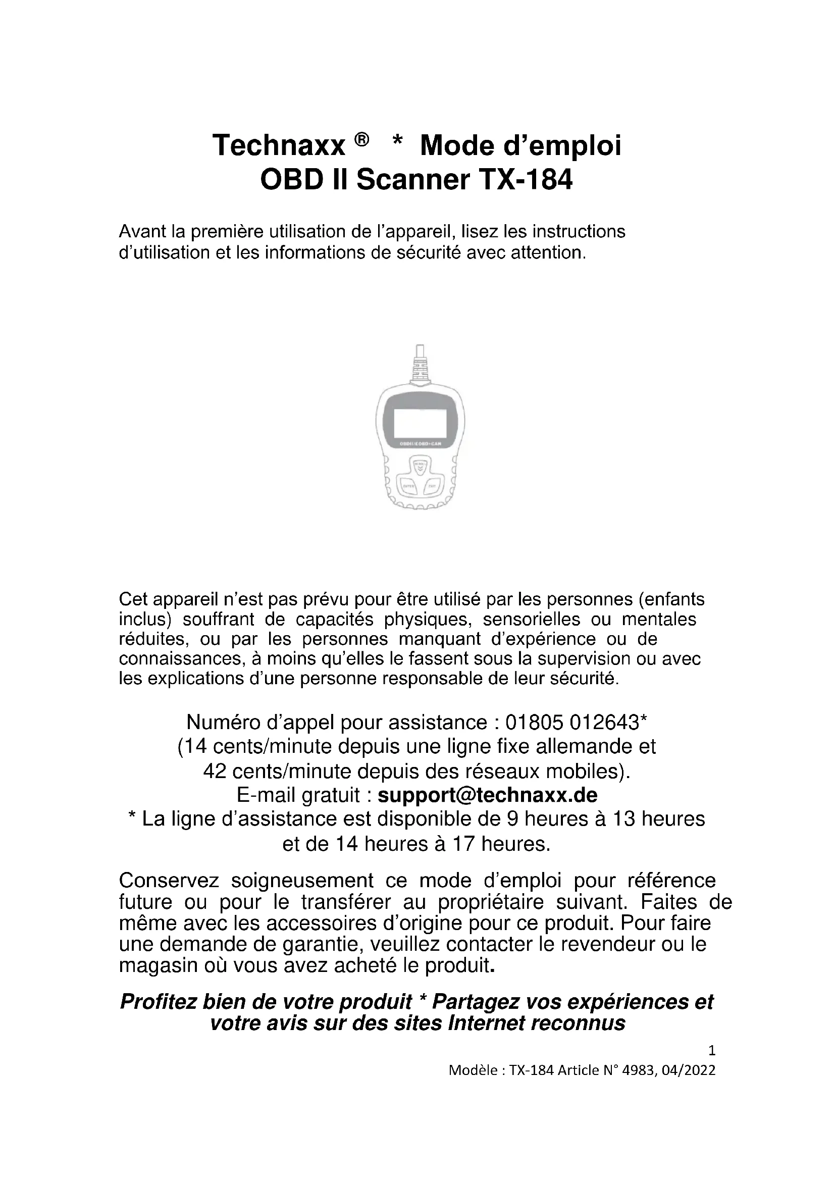 - La ligne d’assistance est disponible de 9 heures à 13 heures et de 14 heures à 17 heures. Conservez soigneusement ce mode d’emploi pour référence future ou pour le transférer au propriétaire suivant. Faites de même avec les accessoires d’origine pour ce produit. Pour faire une demande de garantie, veuillez contacter le revendeur ou le magasin où vous avez acheté le produit. Profitez bien de votre produit * Partagez vos expériences et votre avis sur des sites Internet reconnus2 Modèle : TX-184 Article N° 4983, 04/2022