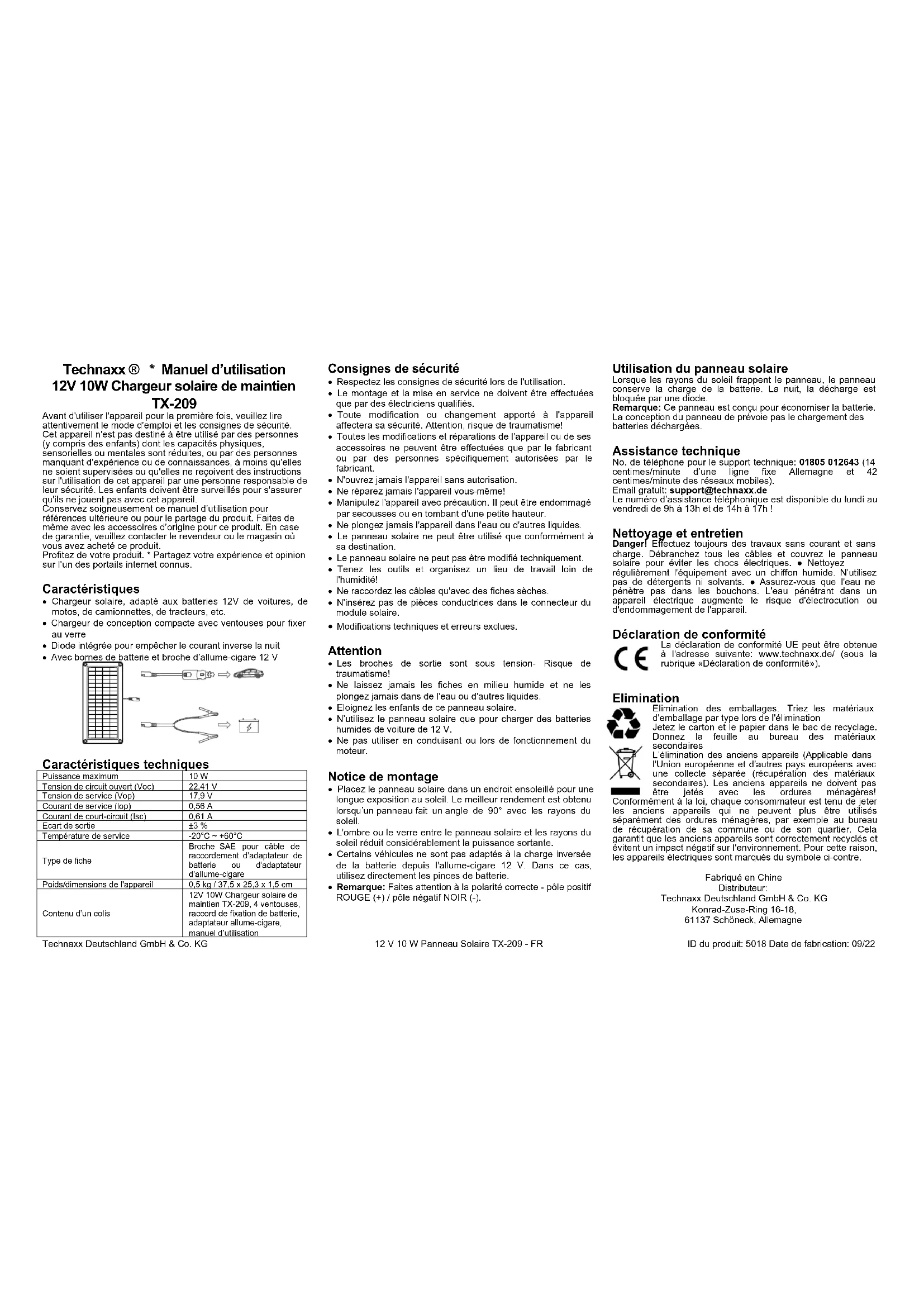 Technaxx Deutschland GmbH & Co. KG 12 V 10 W Panneau Solaire TX-209 - FR ID du produit: 5018 Date de fabrication: 09/22 Technaxx ® * Manuel d’utilisation 12V 10W Chargeur solaire de maintien TX-209 Avant d'utiliser l'appareil pour la première fois, veuillez lire attentivement le mode d'emploi et les consignes de sécurité. Cet appareil n'est pas destiné à être utilisé par des personnes (y compris des enfants) dont les capacités physiques, sensorielles ou mentales sont réduites, ou par des personnes manquant d'expérience ou de connaissances, à moins qu'elles ne soient supervisées ou qu'elles ne reçoivent des instructions sur l'utilisation de cet appareil par une personne responsable de leur sécurité. Les enfants doivent être surveillés pour s'assurer qu'ils ne jouent pas avec cet appareil. Conservez soigneusement ce manuel d’utilisation pour références ultérieure ou pour le partage du produit. Faites de même avec les accessoires d’origine pour ce produit. En case de garantie, veuillez contacter le revendeur ou le magasin où vous avez acheté ce produit. Profitez de votre produit. * Partagez votre expérience et opinion sur l’un des portails internet connus. Caractéristiques