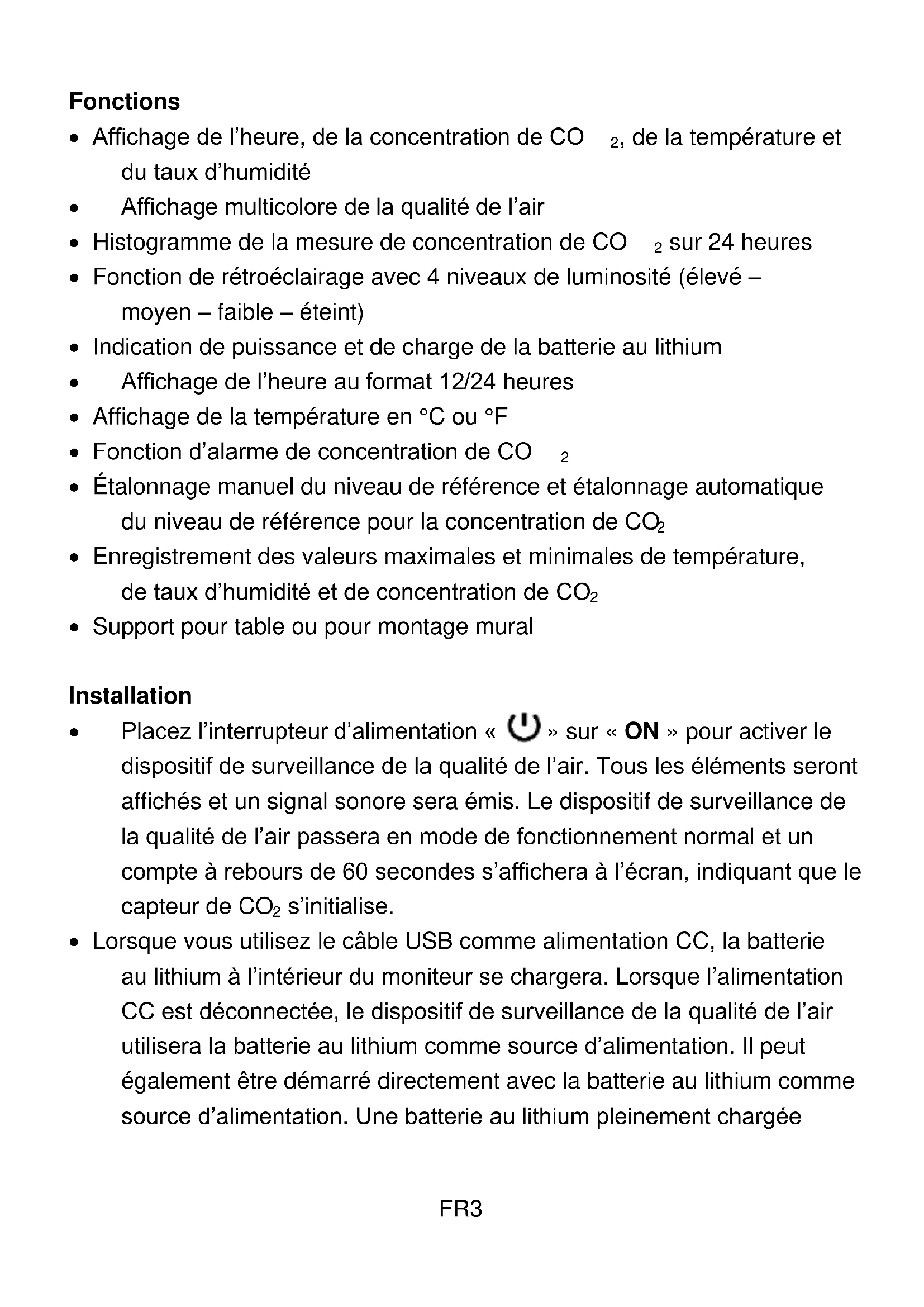 - Il faut compter 20 minutes pour procéder à l’étalonnage manuel du niveau de référence. Pendant l’opération, vous pouvez appuyer sur « UP » pour quitter l’étalonnage en avance. Rétroéclairage Appuyez sur la zone tactile « SNOZZE/LIGHT » pour modifier l’intensité du rétroéclairage. Vous pouvez choisir entre trois niveaux (élevé – moyen – faible – éteint) de luminosité du rétroéclairage.FR10 Indicateur de batterie faible et charge de la batterie L’indicateur de batterie « » affiche la charge restante de la batterie au lithium intégrée. Lorsque le niveau de charge de la batterie au lithium intégrée est faible, un indicateur de batterie faible « » clignotera sur l’écran. À ce moment, l’appareil désactivera la fonction de rétroéclairage, la fonction de détection de dioxyde de carbone, etc. pour assurer le fonctionnement continu de l’affichage de l’heure, jusqu’à ce que la batterie soit rechargée. Lorsque la batterie au lithium est mise en charge, l’indicateur de batterie « » s’affichera se remplissant. Le symbole de la batterie est masqué une fois que la batterie est complètement chargée. Dépannage Pas d’affichage ni de fonctions Vérifiez si le câble USB est correctement connecté à une source d’alimentation. Temps de réponse Assurez-vous que les canaux de circulation d’air à l’arrière du moniteur ne sont pas bloqués ou couverts. La lecture de CO