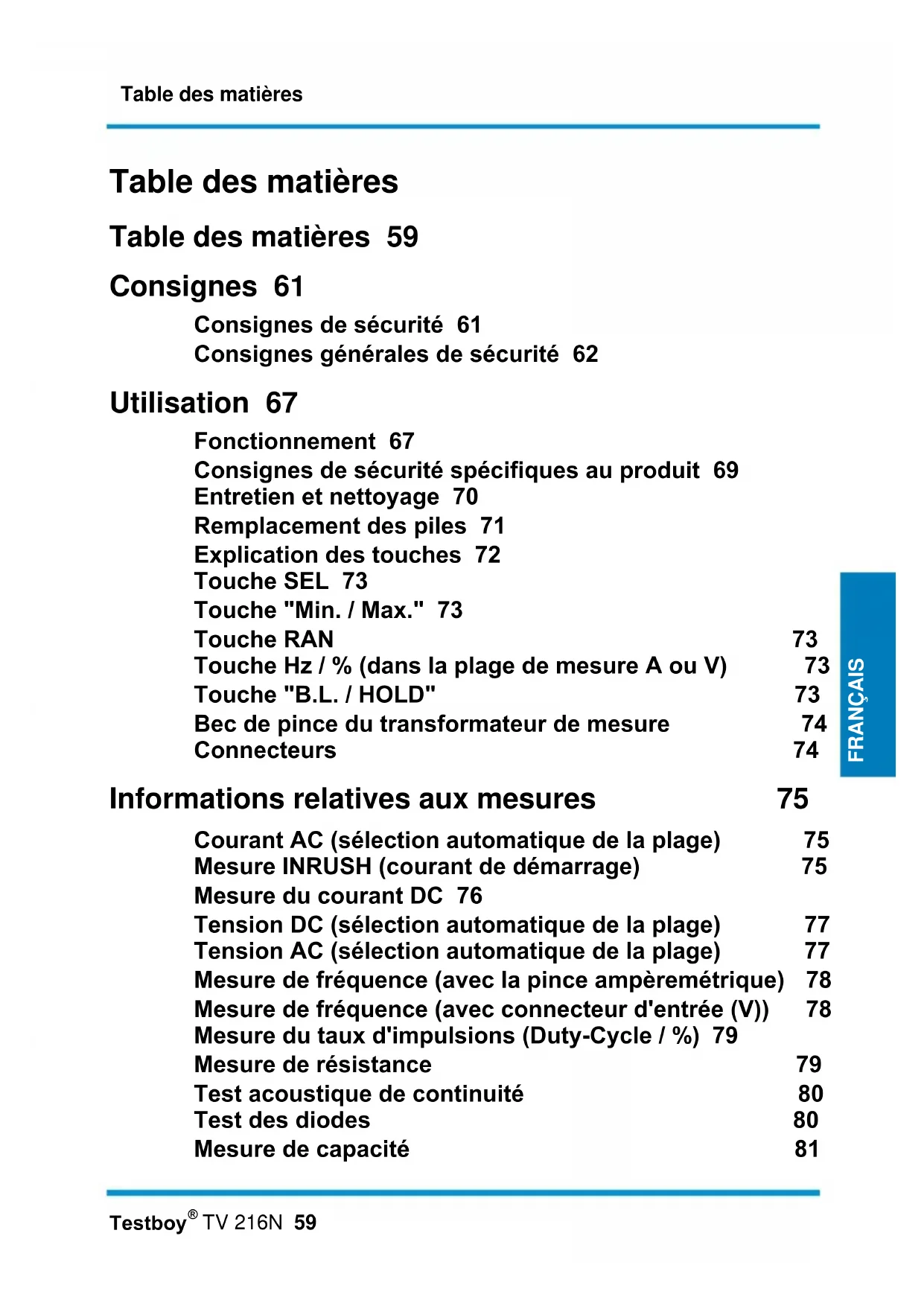 TV 216N 59 FRANÇAIS FRANÇAIS FRANÇAIS Table des matières Table des matières 59 Consignes 61 Consignes de sécurité 61 Consignes générales de sécurité 62 Utilisation 67 Fonctionnement 67 Consignes de sécurité spécifiques au produit 69 Entretien et nettoyage 70 Remplacement des piles 71 Explication des touches 72 Touche SEL 73 Touche "Min. / Max." 73 Touche RAN 73 Touche Hz / % (dans la plage de mesure A ou V) 73 Touche "B.L. / HOLD" 73 Bec de pince du transformateur de mesure 74 Connecteurs 74 Informations relatives aux mesures 75 Courant AC (sélection automatique de la plage) 75 Mesure INRUSH (courant de démarrage) 75 Mesure du courant DC 76 Tension DC (sélection automatique de la plage) 77 Tension AC (sélection automatique de la plage) 77 Mesure de fréquence (avec la pince ampèremétrique) 78 Mesure de fréquence (avec connecteur d'entrée (V)) 78 Mesure du taux d'impulsions (Duty-Cycle / %) 79 Mesure de résistance 79 Test acoustique de continuité 80 Test des diodes 80 Mesure de capacité 81Table des matières