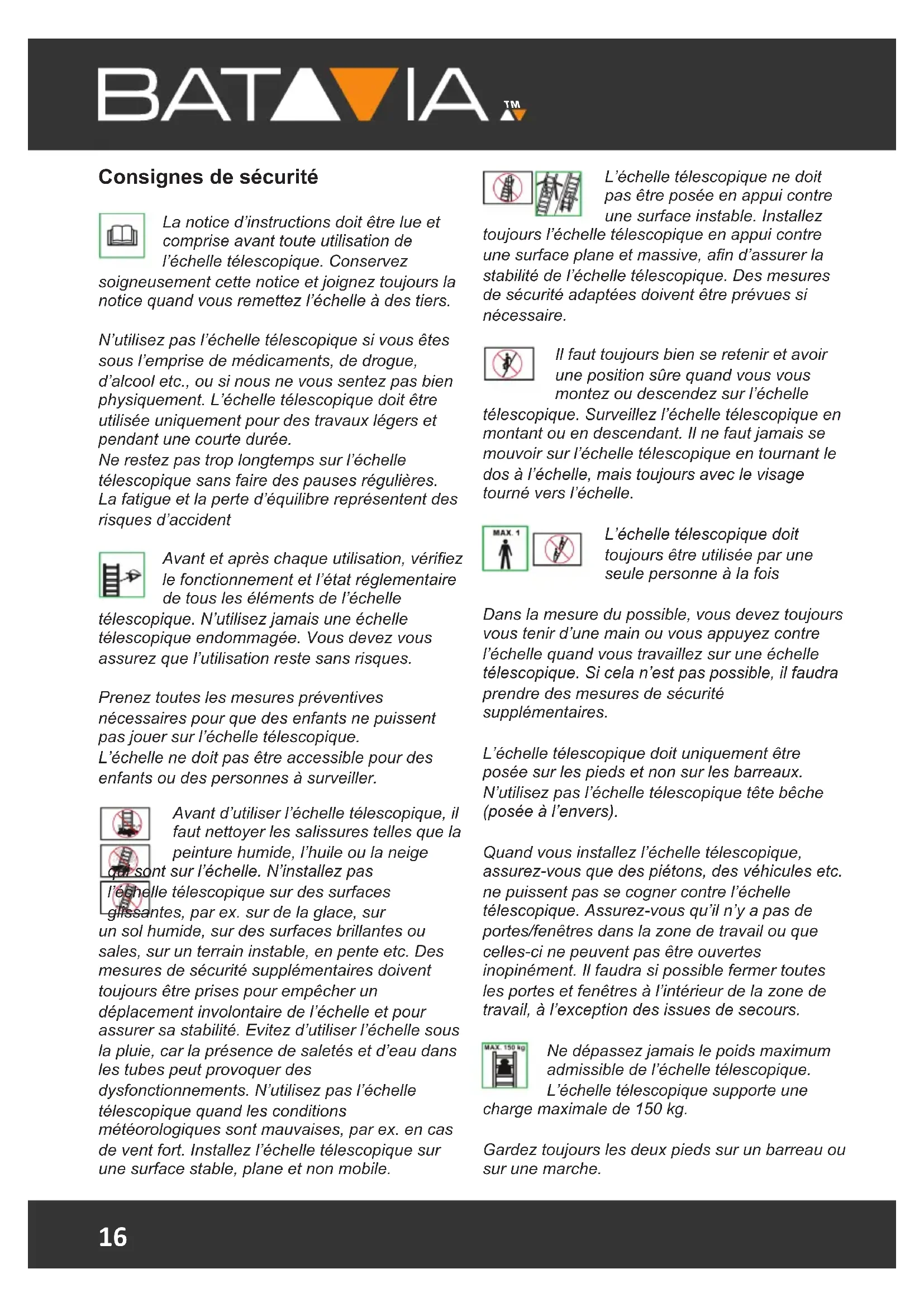 Consignes de sécurité La notice d’instructions doit être lue et comprise avant toute utilisation de l’échelle télescopique. Conservez soigneusement cette notice et joignez toujours la notice quand vous remettez l’échelle à des tiers. N’utilisez pas l’échelle télescopique si vous êtes sous l’emprise de médicaments, de drogue, d’alcool etc., ou si nous ne vous sentez pas bien physiquement. L’échelle télescopique doit être utilisée uniquement pour des travaux légers et pendant une courte durée. Ne restez pas trop longtemps sur l’échelle télescopique sans faire des pauses régulières. La fatigue et la perte d’équilibre représentent des risques d’accident Avant et après chaque utilisation, vériez le fonctionnement et l’état réglementaire de tous les éléments de l’échelle télescopique. N’utilisez jamais une échelle télescopique endommagée. Vous devez vous assurez que l’utilisation reste sans risques. Prenez toutes les mesures préventives nécessaires pour que des enfants ne puissent pas jouer sur l’échelle télescopique. L’échelle ne doit pas être accessible pour des enfants ou des personnes à surveiller. Avant d’utiliser l’échelle télescopique, il faut nettoyer les salissures telles que la peinture humide, l’huile ou la neige qui sont sur l’échelle. N’installez pas l’échelle télescopique sur des surfaces glissantes, par ex. sur de la glace, sur un sol humide, sur des surfaces brillantes ou sales, sur un terrain instable, en pente etc. Des mesures de sécurité supplémentaires doivent toujours être prises pour empêcher un déplacement involontaire de l’échelle et pour assurer sa stabilité. Evitez d’utiliser l’échelle sous la pluie, car la présence de saletés et d’eau dans les tubes peut provoquer des dysfonctionnements. N’utilisez pas l’échelle télescopique quand les conditions météorologiques sont mauvaises, par ex. en cas de vent fort. Installez l’échelle télescopique sur une surface stable, plane et non mobile. L’échelle télescopique ne doit pas être posée en appui contre une surface instable. Installez toujours l’échelle télescopique en appui contre une surface plane et massive, an d’assurer la stabilité de l’échelle télescopique. Des mesures de sécurité adaptées doivent être prévues si nécessaire. Il faut toujours bien se retenir et avoir une position sûre quand vous vous montez ou descendez sur l’échelle télescopique. Surveillez l’échelle télescopique en montant ou en descendant. Il ne faut jamais se mouvoir sur l’échelle télescopique en tournant le dos à l’échelle, mais toujours avec le visage tourné vers l’échelle. L’échelle télescopique doit toujours être utilisée par une seule personne à la fois Dans la mesure du possible, vous devez toujours vous tenir d’une main ou vous appuyez contre l’échelle quand vous travaillez sur une échelle télescopique. Si cela n’est pas possible, il faudra prendre des mesures de sécurité supplémentaires. L’échelle télescopique doit uniquement être posée sur les pieds et non sur les barreaux. N’utilisez pas l’échelle télescopique tête bêche (posée à l’envers). Quand vous installez l’échelle télescopique, assurez-vous que des piétons, des véhicules etc. ne puissent pas se cogner contre l’échelle télescopique. Assurez-vous qu’il n’y a pas de portes/fenêtres dans la zone de travail ou que celles-ci ne peuvent pas être ouvertes inopinément. Il faudra si possible fermer toutes les portes et fenêtres à l’intérieur de la zone de travail, à l’exception des issues de secours. Ne dépassez jamais le poids maximum admissible de l’échelle télescopique. L’échelle télescopique supporte une charge maximale de 150 kg. Gardez toujours les deux pieds sur un barreau ou sur une marche.17