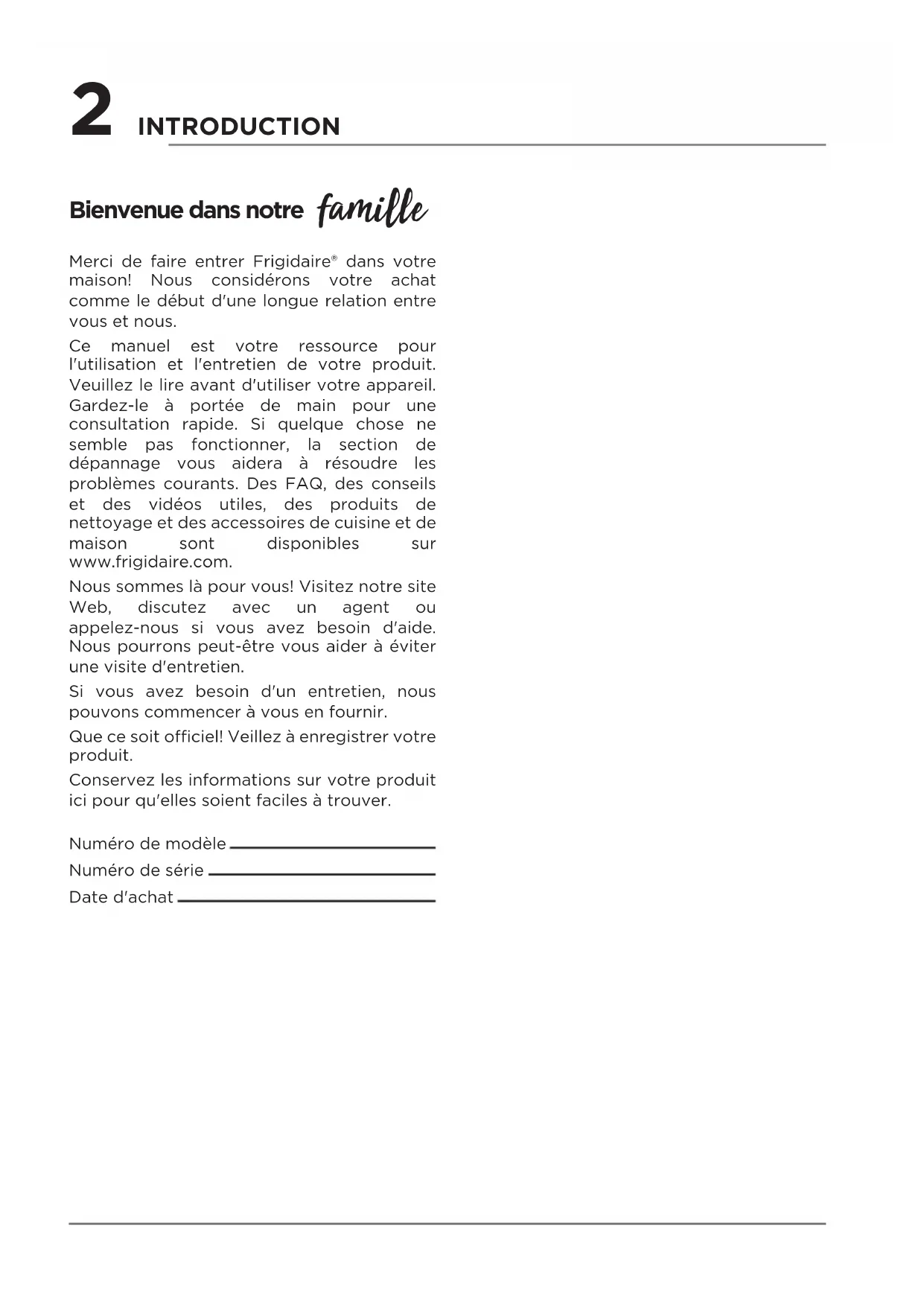 Bienvenue dans notre famie Numéro de modèle Numéro de série Date d'achat Merci de faire entrer Frigidaire® dans votre maison! Nous considérons votre achat comme le début d'une longue relation entre vous et nous. Ce manuel est votre ressource pour l'utilisation et l'entretien de votre produit. Veuillez le lire avant d'utiliser votre appareil. Gardez-le à portée de main pour une consultation rapide. Si quelque chose ne semble pas fonctionner, la section de dépannage vous aidera à résoudre les problèmes courants. Des FAQ, des conseils et des vidéos utiles, des produits de nettoyage et des accessoires de cuisine et de maison sont disponibles sur www.frigidaire.com. Nous sommes là pour vous! Visitez notre site Web, discutez avec un agent ou appelez-nous si vous avez besoin d'aide. Nous pourrons peut-être vous aider à éviter une visite d'entretien. Si vous avez besoin d'un entretien, nous pouvons commencer à vous en fournir. Que ce soit ociel! Veillez à enregistrer votre produit. Conservez les informations sur votre produit ici pour qu'elles soient faciles à trouver.3 Pour votre sécurité