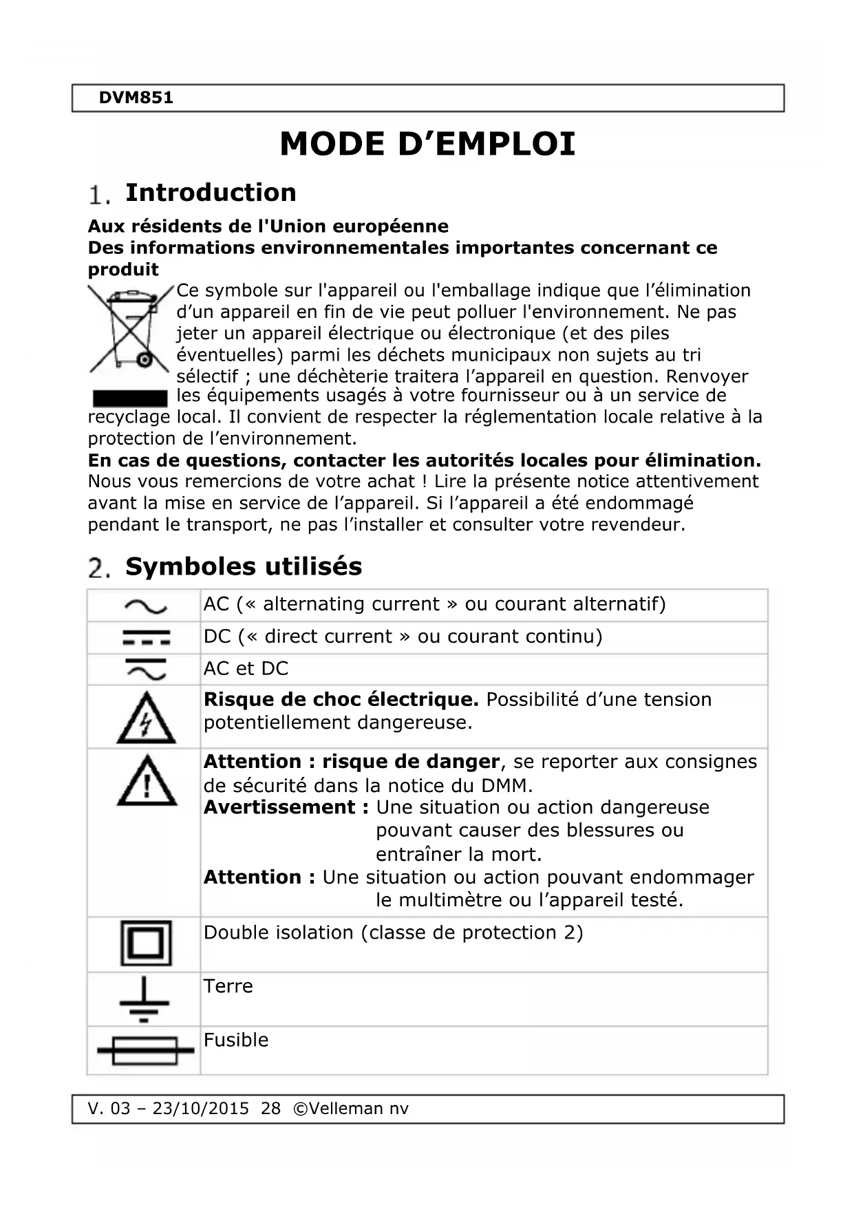 DVM852 - Multimètre VELLEMAN - Notice d'utilisation et mode d'emploi gratuit