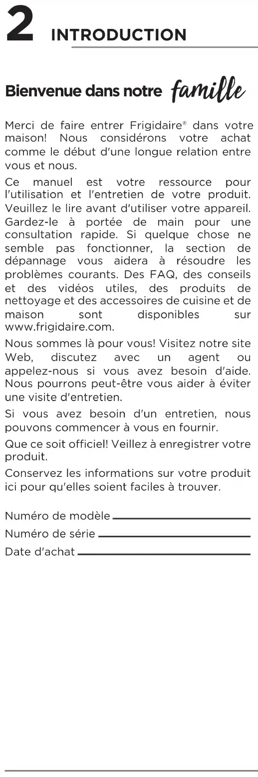 - Garantie Limité D’appareil Principale INTRODUCTION Bienvenue dans notre famie Numéro de modèle Numéro de série Date d'achat Merci de faire entrer Frigidaire® dans votre maison! Nous considérons votre achat comme le début d'une longue relation entre vous et nous. Ce manuel est votre ressource pour l'utilisation et l'entretien de votre produit. Veuillez le lire avant d'utiliser votre appareil. Gardez-le à portée de main pour une consultation rapide. Si quelque chose ne semble pas fonctionner, la section de dépannage vous aidera à résoudre les problèmes courants. Des FAQ, des conseils et des vidéos utiles, des produits de nettoyage et des accessoires de cuisine et de maison sont disponibles sur www.frigidaire.com. Nous sommes là pour vous! Visitez notre site Web, discutez avec un agent ou appelez-nous si vous avez besoin d'aide. Nous pourrons peut-être vous aider à éviter une visite d'entretien. Si vous avez besoin d'un entretien, nous pouvons commencer à vous en fournir. Que ce soit ociel! Veillez à enregistrer votre produit. Conservez les informations sur votre produit ici pour qu'elles soient faciles à trouver.3 Pour votre sécurité p. 222