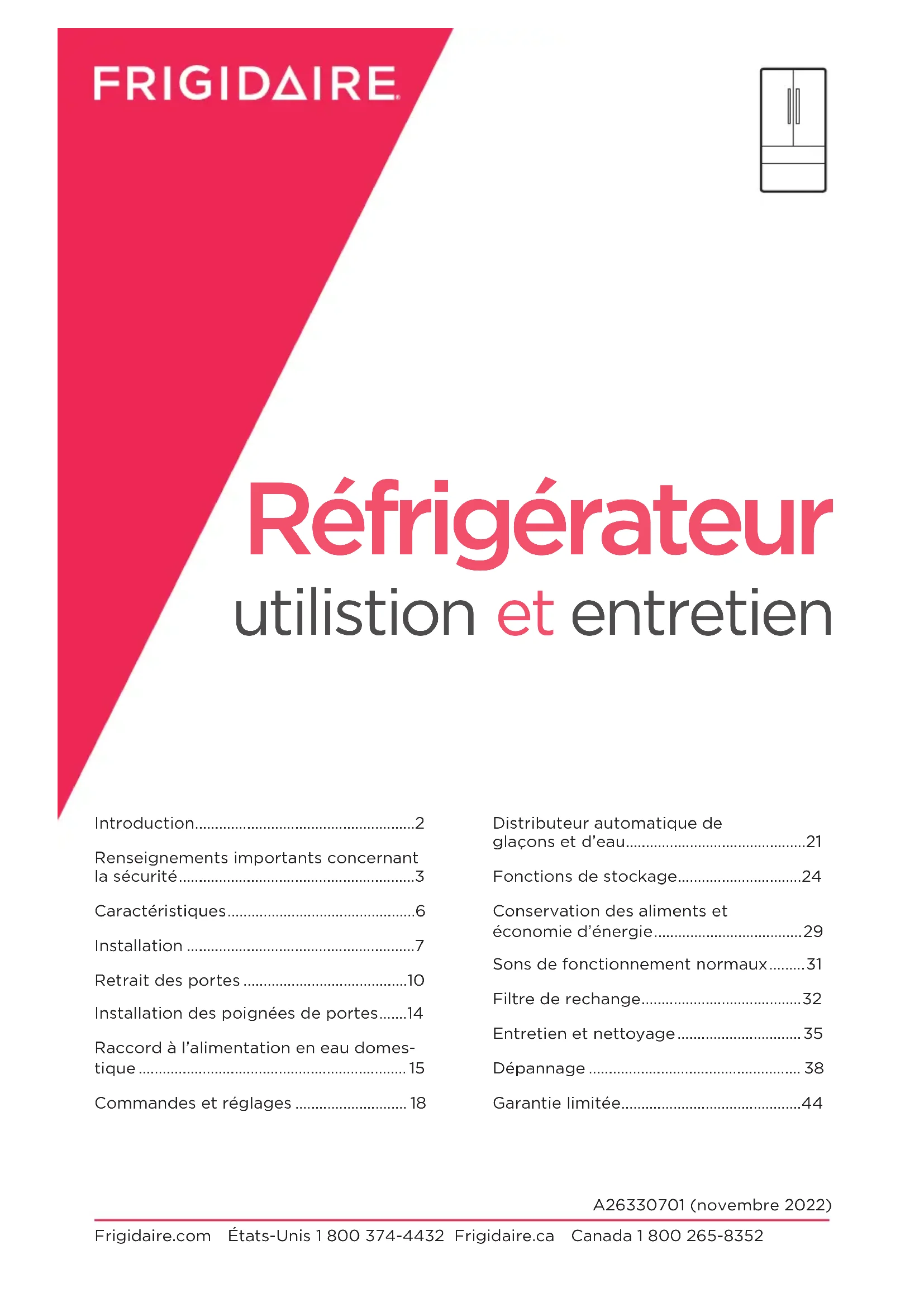 - Frigidaire.com États-Unis 1800374-4432 Frigidaire.ca Canada 1800265-8352 Réfrigérateur utilistion et entretien Introduction p. 2