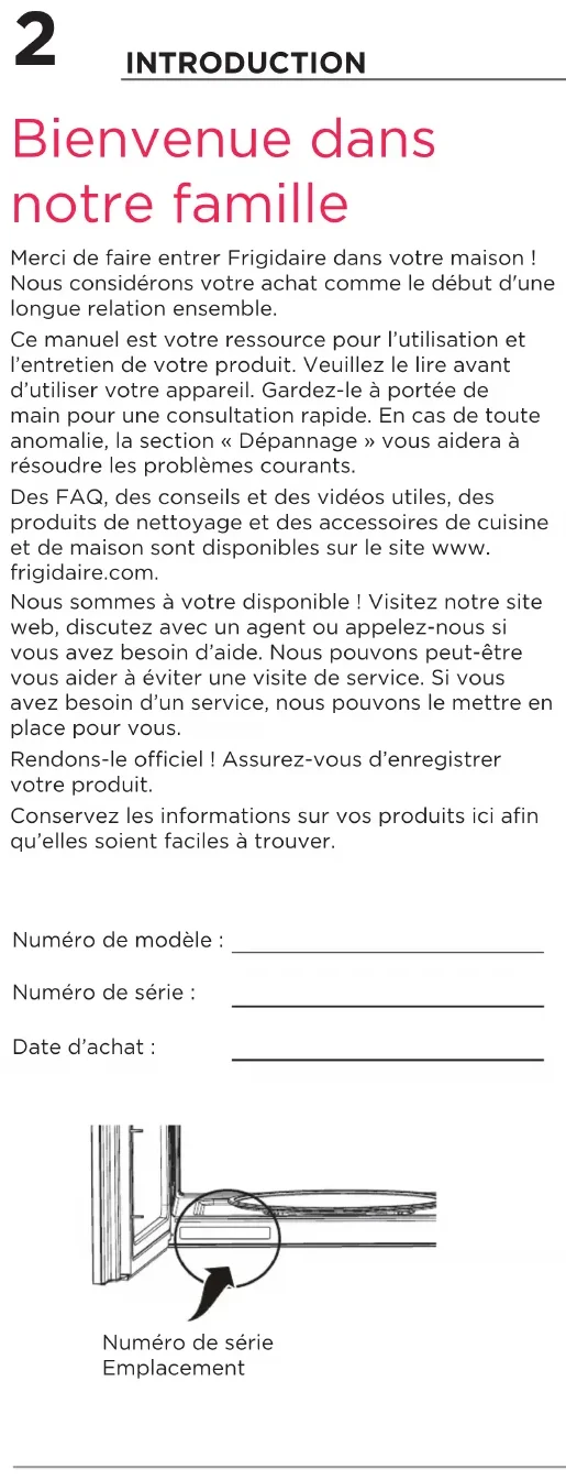 A06823450 (Octobre 2022) Frigidaire.com USA 1-800-374-4432 Frigidaire.ca Canada 1-800-265-8352Bienvenue dans notre famille Merci de faire entrer Frigidaire dans votre maison ! Nous considérons votre achat comme le début d'une longue relation ensemble. Ce manuel est votre ressource pour l’utilisation et l’entretien de votre produit. Veuillez le lire avant d’utiliser votre appareil. Gardez-le à portée de main pour une consultation rapide. En cas de toute anomalie, la section «Dépannage» vous aidera à résoudre les problèmes courants. Des FAQ, des conseils et des vidéos utiles, des produits de nettoyage et des accessoires de cuisine et de maison sont disponibles sur le site www. frigidaire.com. Nous sommes à votre disponible ! Visitez notre site web, discutez avec un agent ou appelez-nous si vous avez besoin d’aide. Nous pouvons peut-être vous aider à éviter une visite de service. Si vous avez besoin d’un service, nous pouvons le mettre en place pour vous. Rendons-le officiel ! Assurez-vous d’enregistrer votre produit. Conservez les informations sur vos produits ici afin qu’elles soient faciles à trouver. Numéro de modèle : Numéro de série : Date d’achat :
