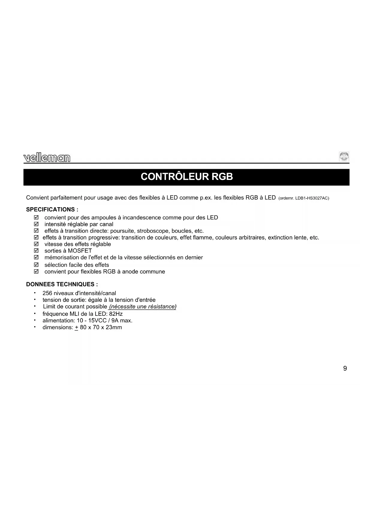 Convient parfaitement pour usage avec des flexibles à LED comme p.ex. les flexibles RGB à LED (ordernr. LDB1-HS3027AC) SPECIFICATIONS : convient pour des ampoules à incandescence comme pour des LED intensité réglable par canal effets à transition directe: poursuite, stroboscope, boucles, etc. effets à transition progressive: transition de couleurs, effet flamme, couleurs arbitraires, extinction lente, etc. vitesse des effets réglable sorties à MOSFET mémorisation de l'effet et de la vitesse sélectionnés en dernier sélection facile des effets convient pour flexibles RGB à anode commune DONNEES TECHNIQUES : 256 niveaux d'intensité/canal tension de sortie: égale à la tension d'entrée Limit de courant possible (nécessite une résistance) fréquence MLI de la LED: 82Hz alimentation: 10 - 15VCC / 9A max. dimensions: + 80 x 70 x 23mm10