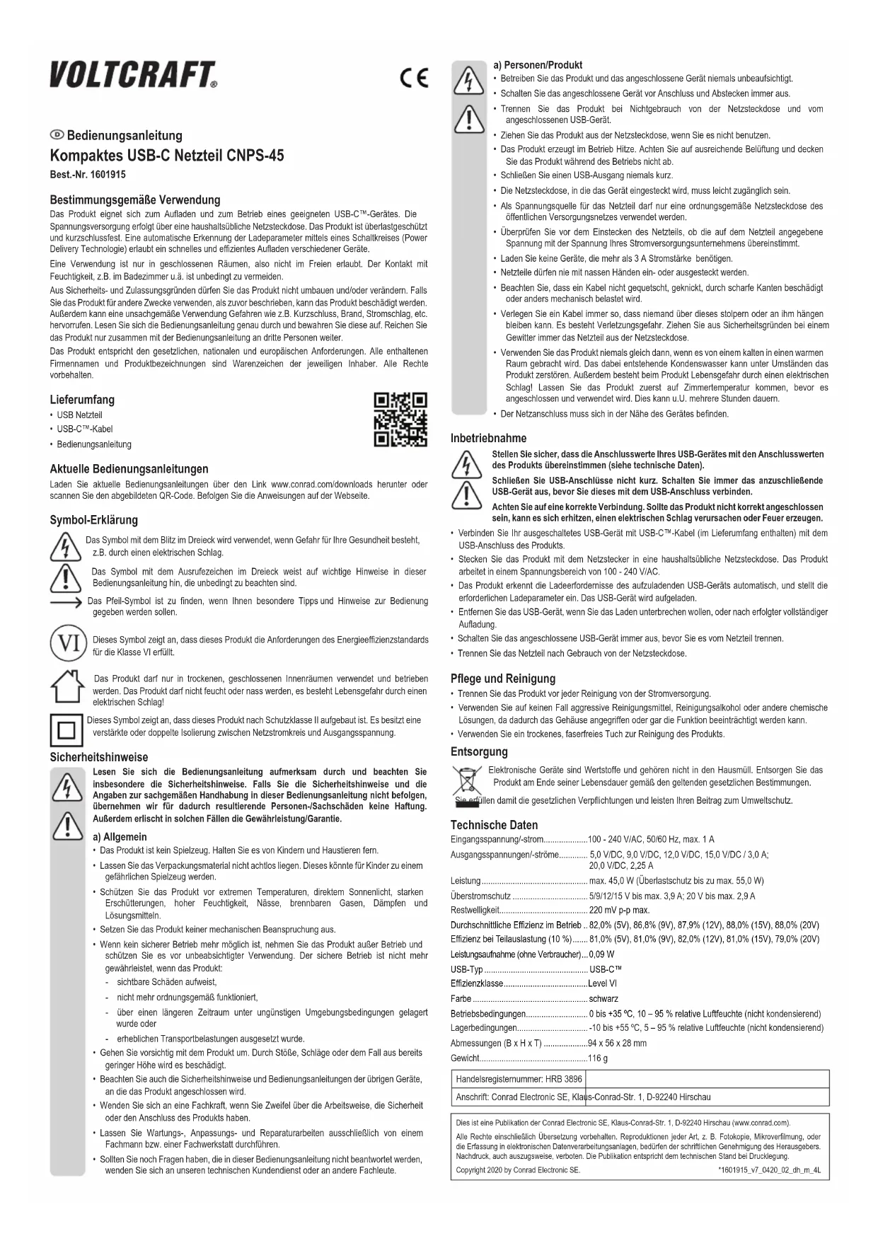 - Disconnect the product from the mains socket when you are not using it. This is a publication by Conrad Electronic SE, Klaus-Conrad-Str. 1, D-92240 Hirschau (www.conrad.com). All rights including translation reserved. Reproduction by any method (e.g. photocopying, microlming, or the capture in electronic data processing systems) requires prior written approval from the editor. Reprinting, also in part, is prohibited. This publication represent the technical status at the time of printing. Copyright 2020 by Conrad Electronic SE. *1601915_v7_0420_02_dh_m_4LMode d'emploi Bloc d'alimentation USB-C compact CNPS-45 Nº de commande 1601915 Utilisation prévue Ce produit permet de recharger et d'alimenter un appareil USB-C™ compatible. L’alimentation en énergie électrique est fournie via une prise de courant domestique classique. Le produit est protégé contre les surcharges et courts-circuits. Une détection automatique des paramètres de charge via un circuit intégré (Technologie Power Delivery) permet le chargement rapide et efcace de différents appareils. L'utilisation est uniquement autorisée en intérieur, dans les locaux fermés ; l'utilisation en plein air est interdite. Éviter impérativement tout contact avec l'humidité, par ex. dans une salle de bains, etc. Pour des raisons de sécurité et d'homologation, toute transformation et/ou modication du produit est interdite. Si vous utilisez le produit à d’autres ns que celles décrites précédemment, vous risquez de l’endommager. Par ailleurs, une utilisation incorrecte peut être source de dangers tels que court-circuit, incendie, électrocution. Lisez attentivement le mode d'emploi et conservez-le. Ne donnez le produit à un tiers qu'accompagné de son mode d'emploi. Le produit est conforme aux exigences des directives européennes et nationales en vigueur. Tous les noms d'entreprises et appellations de produits contenus dans ce mode d'emploi sont des marques déposées des propriétaires correspondants. Tous droits réservés. Contenu
