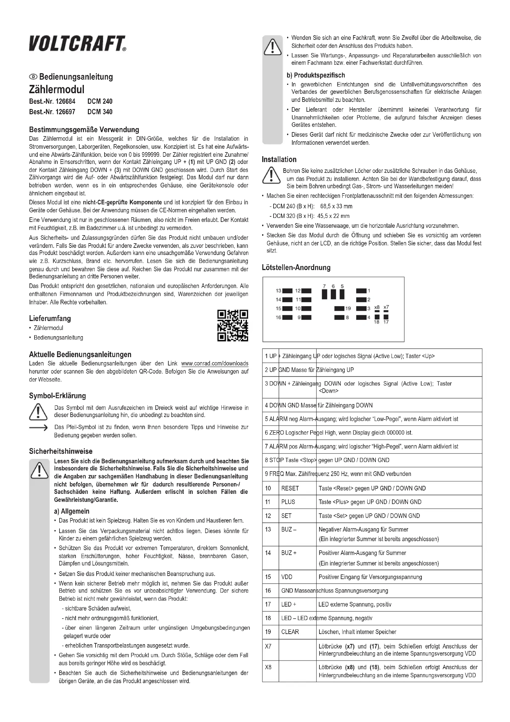 - Ajustez le module sur le trou ainsi pratiqué et poussez-le doucement par son boîtier, pas parl’afcheurLCD,jusqu’àcequ’ilseverrouilleenplace.Assurez-vousquelemoduleest correctement placé. Fonctionnement du solderpad 1 UP + Entrée de comptage UP ou signal logique (Active Low) ; bouton- poussoir <Up> 2 UP GND Sol pour entrée de comptage UP 3 DOWN + Entrée de comptage DOWN ou signal logique (Actif bas) ; bouton- poussoir <Down> 4 DOWN GND Sol pour entrée de comptage DOWN 5 ALARM neg Sortie d'alarme ; devient la logique de bas niveau quand l’alarme est activée. 6 ZERO Lehautdeniveaudelogiquequandl’afchageest000000. 7 ALARM pos Sortie d'alarme ; la logique de haut niveau quand l'alarme est activée 8 STOP Touche <Stop> contre UP GND / DOWN GND 9 FREQ Fréquence de comptage max. 250 Hz si connecté avec GND 10 RESET Touche <Reset> contre UP GND / DOWN GND 11 PLUS Touche <Plus> contre UP GND / DOWN GND 12 SET Touche <Set> contre UP GND / DOWN GND 13 BUZ – Sortie négative de l’alarme pour buzzer (Un buzzer intégré est déjà connecté) 14 BUZ + Sortie positive de l’alarme pour buzzer (Un buzzer intégré est déjà connecté) 15 VDD Exploitation positive du voltage 16 GND Exploitation du sol du voltage 17 LED + LED externe du voltage positif 18 LED – LED externe du voltage négatif 19 CLEAR Effacez la mémoire dans la mémoire interne X7 Fermez les tampons (x7) et (17) pour les provisions de voltage de la lumière postérieure positive sur le VDD interne. X8 Fermez les tampons (x8) et (18) pour les provisions de voltage de la lumière postérieure négative sur le VDD interne. Mode d'emploi Module de comptage Code art. 126684 DCM 240 Code art. 126697 DCM 340 Utilisation prévue Le module de comptage est un appareil de mesure de taille normalisée DIN conçu pour être installé dans des alimentations de puissance, des équipements de laboratoire, des panneaux de contrôle, etc. Il peut compter le temps de 0.1 Heure à 999999.9 Heures. Le module de comptage enregistre une augmentation/diminution par incréments, si le contact de l’entrée de comptage est fermée UP + (1) avec UP GND (2) ou DOWN + (3) avec DOWN GND. Par démarrage du processus de comptage, la fonction de comptage vers le haut ou vers le bas est dénie. Le module ne peut être utilisé qu’un fois installé dans un boîtier, un panneau d’instrumentation, une console ou un endroit similaire. Ce module est un composant non testé CE et est conçu pour être monté dans des appareils ou des boîtiers. Veuillez respecter les normes CE lors de l'utilisation. L'utilisation est uniquement autorisée en intérieur, dans les locaux fermés ; l'utilisation en plein air est interdite. Éviter impérativement tout contact avec l'humidité, par ex. dans la salle de bains, etc. Pourdesraisonsde sécuritéet d'homologation,toute transformationet/ou modicationdu produitestinterdite.Sivousutilisezleproduitàd'autresnsquecellesdécritesprécédemment, cela risque d'endommager le produit. Par ailleurs, une utilisation incorrecte peut être source de dangers tels que court-circuit, incendie. Lisez attentivement le mode d'emploi et conservez-le. Ne donnez le produit à un tiers qu'accompagné de son mode d'emploi. Le produit est conforme aux exigences des directives européennes et nationales en vigueur. Tous les noms d’entreprises et toutes les appellations de produits indiqués sont des marques déposées par chaque propriétaire. Tous droits réservés. Contenu d'emballage