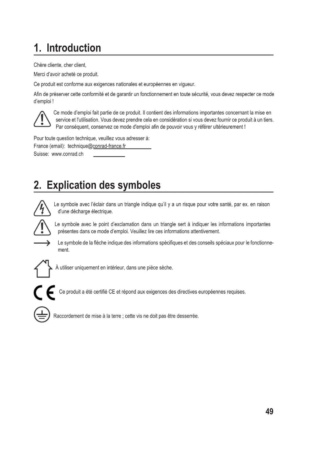Chère cliente, cher client, Merci d’avoir acheté ce produit. Ce produit est conforme aux exigences nationales et européennes en vigueur. Andepréservercetteconformitéetdegarantirunfonctionnemententoutesécurité,vousdevezrespectercemode d’emploi ! Ce mode d’emploi fait partie de ce produit. Il contient des informations importantes concernant la mise en service et l'utilisation. Vous devez prendre cela en considération si vous devez fournir ce produit à un tiers. Parconséquent,conservezcemoded'emploiandepouvoirvousyréférerultérieurement! Pour toute question technique, veuillez vous adresser à: France (email): technique@conrad-france.fr Suisse: www.conrad.ch