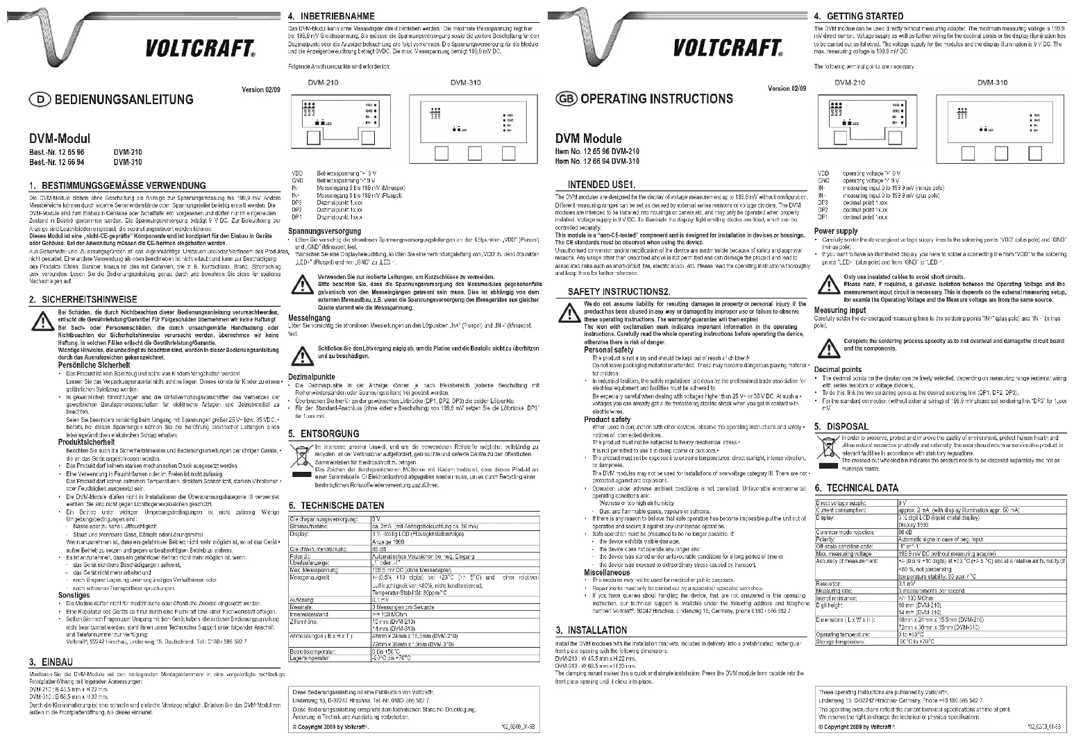 Version 02/09 Module de voltmètre digital DVM Nº de commande 12 65 96 DVM-210 Nº de commande 12 66 94 DVM-310 UTILISATION PRÉVUE1. Le module de voltmètre digital sans câblage supplémentaire sert d’afcheur de la tension mesurée jusqu’à 199,9 mV. D’autres plages de mesure peuvent être créées librement par le montage de résistances série externes ou des diviseurs de tension. Ce module de voltmètre digital est prévu pour être monté dans un boîtier ou dans un panneau de commande etc. et ne doit être mis en service qu’après avoir été encastré. L’alimentation en courant est assurée par 9 V DC. L’éclairage de l’afcheur est effectué par des diodes électroluminescentes qui peuvent être commandées individuellement. Ce module est un composant „non testé CE“ et est conçu pour être monté dans des appareils ou boîtiers. Les normes CE doivent être respectées durant son utilisation. La conversion et/ou la modication non autorisées de l’appareil ne sont pas permises pour des raisons de sécurité et d’approbation. Tout usage autre que celui décrit ci-dessus est interdit, peut endommager le produit et poser des risques tels que courts-circuits, incendies, chocs électriques, etc. Prière de lire attentivement le mode d’emploi et de le conserver à titre de référence. CONSIGNES DE SÉCURITÉ2. Nous déclinons toute responsabilité en cas de dommages matériels ou de blessures dans le cas où cet appareil aurait été maltraité de quelque façon que ce soit ou endommagé du fait d’une mauvaise utilisation ou d’un non respect de ce mode d’emploi. La garantie en serait d’ailleurs annulée! Le point d’exclamation attire l’attention sur une information importante dont il convient de tenir compte impérativement. Sécurité des personnes Ce produit n’est pas un jouet et doit être tenu hors de portée des enfants!• Ne laissez pas traîner négligemment le matériel d’emballage. Il pourrait devenir un jouet • dangereux pour les enfants. Dans les locaux professionnels, il faut observer les instructions pour la prévention des • accidents émises par les associations professionnelles exerçant dans le domaine des installations électriques et de l’outillage industriel. Soyez avant tout très vigilant lors du maniement de tensions supérieures à 25 V~ • respectivement à 35 V DC. De telles tensions peuvent, déjà au contact de lignes électriques, provoquer une décharge électrique mortelle. Sécurité du produit Si vous raccordez ce produit à d’autres appareils, consultez le mode d’emploi et les consignes • de sécurité de ces autres appareils. Ne soumettez pas ce produit à de fortes contraintes mécaniques.• L’utilisation dans les locaux humides ou à l’extérieur n’est pas permise.• Ce produit ne doit pas être exposé à des températures extrêmes, aux rayons directs du soleil • ou à d’intenses vibrations. Le module de voltmètre digital ne doit pas être utilisé dans des installations de la catégorie de • surtension III. Il n’est pas protégé contre les explosions provoquées par un arc électrique. Un fonctionnement dans des conditions d’environnement défavorables est interdit. Des • conditions d’environnement défavorables sont par exemple : une humidité ou un taux d’hygrométrie trop élevé - de la poussière et des gaz, vapeurs ou solutions inammables - S’il est probable qu’une utilisation sans danger n’est plus possible, mettez l’appareil hors • service et protégez-le contre toute utilisation involontaire. Une utilisation sans danger n’est plus possible si :• l’appareil présente des dommages visibles, - l’appareil ne fonctionne plus et - après un long stockage dans des conditions défavorables ou - l’appareil a été transporté dans des conditions défavorables. - Divers Les modules ne doivent pas être utilisés dans le domaine médical ou public.• La réparations ou de réglages ne peuvent être effectués que par un spécialiste ou un atelier • spécialisé. L´appareil de mesure pour lesquelles vous ne trouvez pas de réponses dans le présent • mode d’emploi, nos support technique se tient volontiers à votre disposition à l´adresse et au numéro de téléphone suivants: Voltcraft