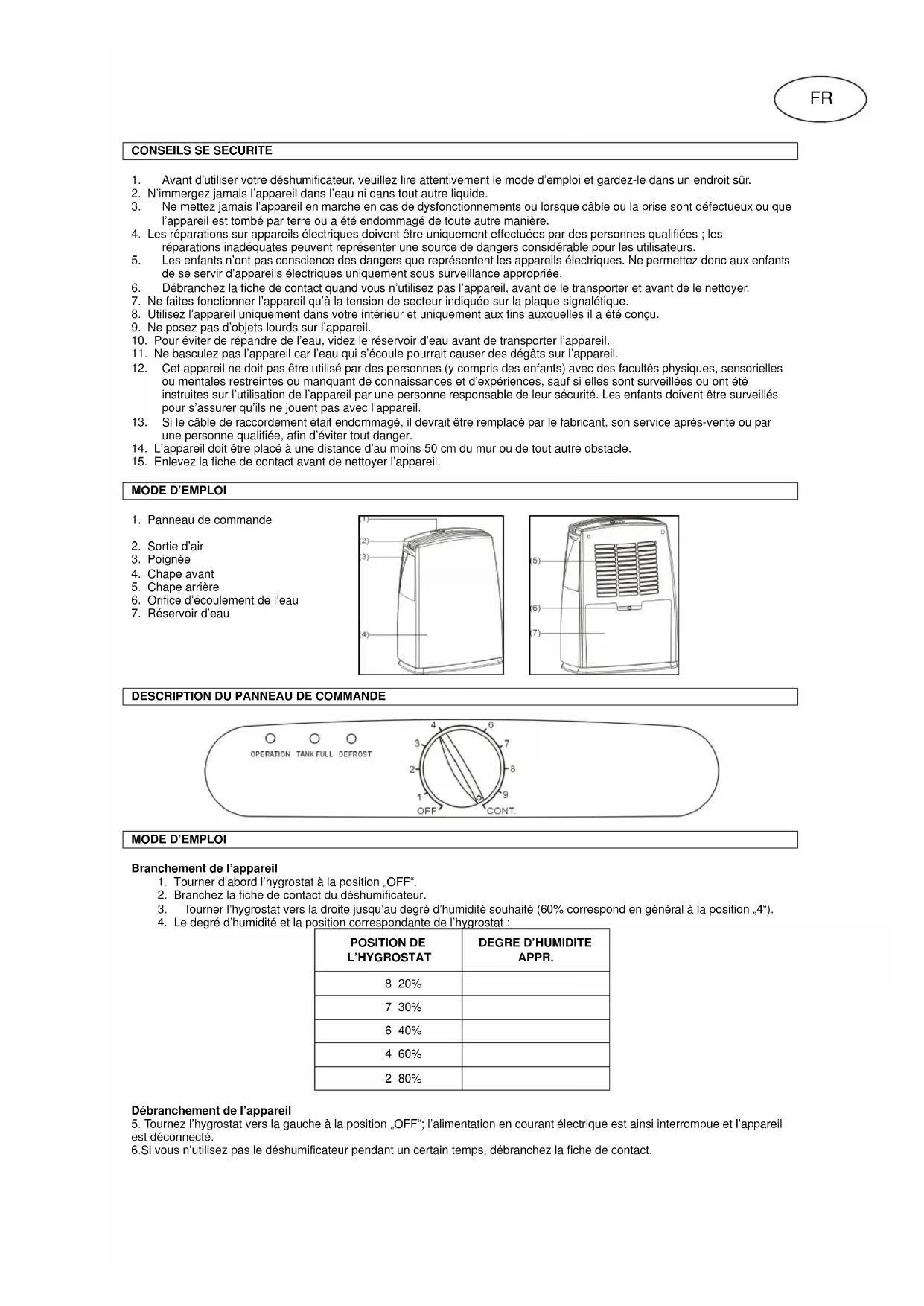 APPR. 8 20% 7 30% 6 40% 4 60% 2 80% Débranchement de l’appareil 5. Tournez l’hygrostat vers la gauche à la position „OFF“; l’alimentation en courant électrique est ainsi interrompue et l’appareil est déconnecté. 6.Si vous n’utilisez pas le déshumificateur pendant un certain temps, débranchez la fiche de contact.