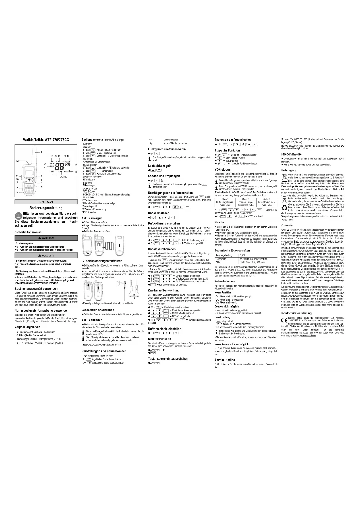 , 300 mA). La puissance nulle est d'env. 0,08 W. L'efficacité moyenne est d'env. 77 %. La puissance absorbée est de 1,7 W maximum. Elimination d'erreurs Si vous avez des problèmes avec votre émetteur-récepteur, contrôlez d'abord les points suivants. Pas de fonction - Les piles ne sont pas insérées correctement. - Les piles ne sont pas chargées. - Les piles sont défectueuses. Émission pas possible - n'est pas complètement appuyée. - Votre canal est utilisé par d'autres correspondants. Pas de réception - est appuyée. - Le volume est trop faible. - Vous vous trouvez en dehors de la zone de réception. Des obstacles, comme des arbres ou des bâtiments, exercent une influence négative sur la portée. - Servez-vous de la fonction de balayage pour chercher des signaux faibles. Pas de communication possible - Pour parler avec d'autres correspondants, tous les appareils doivent être réglés sur le même canal et sur le même code d'appel. Ligne directe d'assistance En cas de problèmes techniques, adressez-vous à notre ligne directe d'assistance. Suisse : Tél. 0900 00 1675 (frais Swisscom à l'impression de ce mode d'emploi : CHF 2,60/min). Si vous jouissez de droits de garantie, adressez-vous à votre revendeur. La durée de la garantie est de 2 ans. Remarques concernant l'entretien Æ Nettoyez les surfaces des boîtiers avec un chiffon doux et non pelucheux. Æ N'utilisez pas de produits d'entretien ni de solvants. Traitement de l'appareil hors d'usage Si vous ne voulez plus servir de votre appareil, veuillez l'ap porter au centre de collecte de l'organisme de traitement des déchets de votre commune (par ex. centre de recyclage). D'après la loi relative aux appareils électriques et électroniques, les propriétaires d'appareils usagés sont tenus de mettre tous les appareils électriques et électroniques usagés dans un collecteur séparé. L'icône ci-contre signifie que vous ne devez en aucun cas jeter votre appareil dans les ordures ménagères ! Vous êtes tenus par la loi d'éliminer vos piles et piles re chargeables auprès d'un revendeur de piles ainsi qu'auprès de centres de collecte responsables de leur élimination qui mettent des conteneurs adéquats à disposition. Ce geste éco responsable est gratuit. L'icône ci-contre signifie que vous ne devez en aucun cas jeter les piles et piles rechargeables dans les ordures ménagères, mais que vous devez les apporter à un centre de collecte. Éliminez les fournitures d'emballage conformément au règlement local. Garantie Les appareils SWITEL sont fabriqués et contrôlés selon des procédés de haut niveau. Des matériaux sélectionnés et des technologies de pointe ont pour effet un fonctionnement irréprochable et une longue durée de vie. La garantie n'est pas valable pour les piles, les piles re chargeables ou les packs de piles rechargeables utilisés dans les pro duits. La durée de la garantie est de 24 mois à partir de la date d'achat. Pendant la durée de la garantie, tous les défauts dus à des vices de matériel ou de fabrication seront éliminés gratuitement. Le droit à la garantie expire en cas d'intervention de l'acheteur ou de tiers. Les dommages provenant d'un maniement ou d'une manipulation in corrects, d'une usure naturelle, d'une mauvaise mise en place ou d'une mauvaise conservation, d'un raccordement ou d'une instal lation incorrects ainsi que d'un cas de force majeure ou autres in fluences extérieures sont exclus de la garantie. En cas de ré clamations, nous nous réservons le droit de réparer, de remplacer les pièces défectueuses ou d’échanger l’appareil. Les composants rem placés ou les appareils échangés deviennent notre propriété. Les demandes de dommages et intérêts sont exclues tant qu'elles ne re posent pas sur l'intention ou une négligence grossière du fabricant. Si votre appareil présentait malgré tout une défectuosité pendant la période de garantie, veuillez vous adressez, muni de la quittance d'achat, exclusivement au magasin où vous avez acheté votre appareil SWITEL. Tous les droits de garantie basés sur ces dispo sitions ne peuvent être revendiqués qu’auprès de votre revendeur. Deux ans après l'achat et la remise de nos produits, il n'est plus possible de faire valoir les droits à la garantie. Déclaration de conformité Cet appareil est en conformité avec la directive 1999/5/CE sur les installations de radio et de télécommunication et la recon naissance réciproque de leur conformité. La conformité avec la directive mentionnée ci-dessus est confirmée par la marque CE placée sur l’appareil. Vous pouvez télécharger gratuitement la décla ration de conformité intégrale depuis notre site Internet www.switel.com .Walkie Talkie WTF 770/777CC