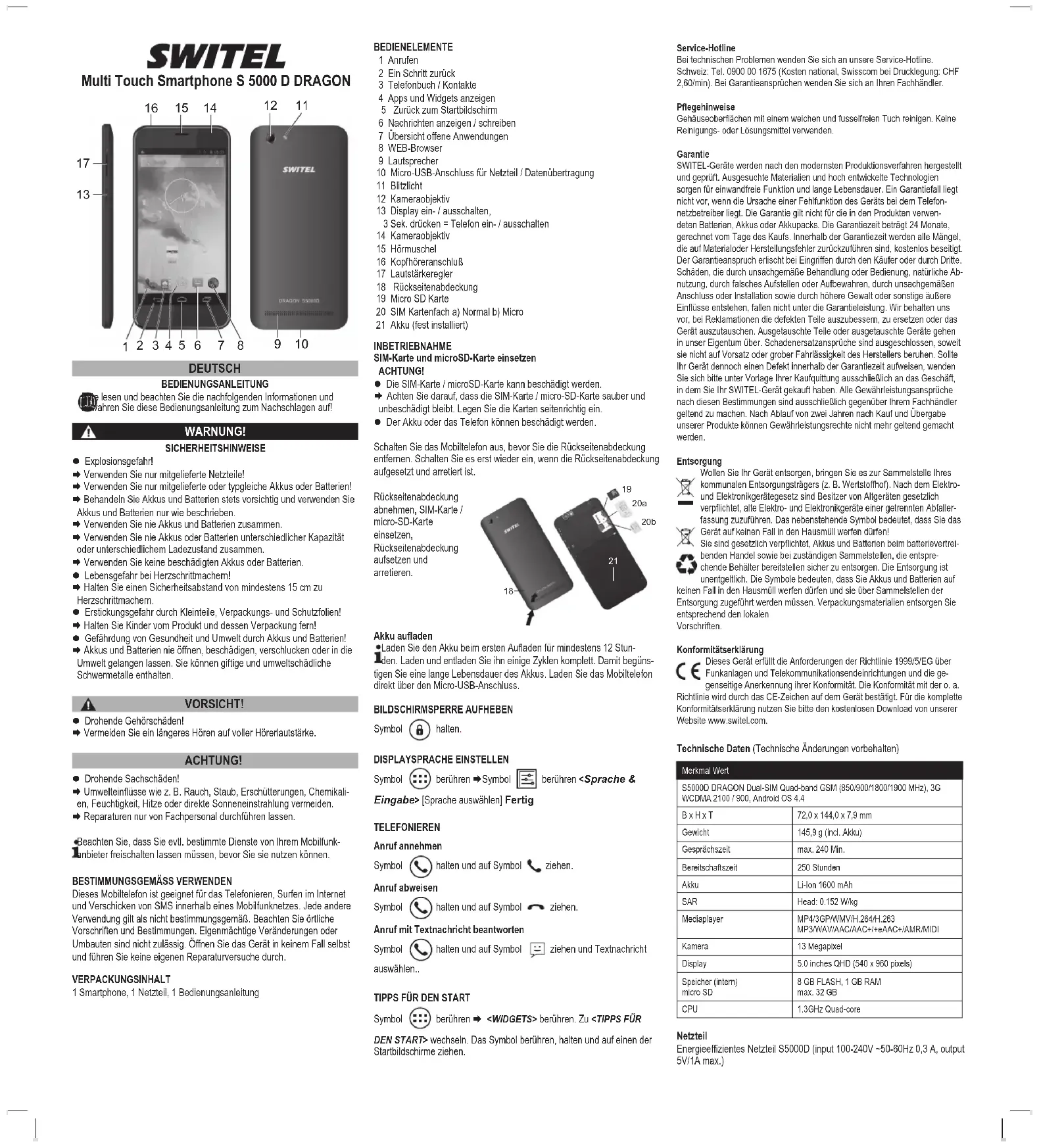 18PRUDENCE ! ATTENTION ! Ligne d‘assistance directe En cas de problèmes techniques, adressez-vous à notre ligne d‘assistance directe. Suisse : Tél. 0900 00 1675 (frais Swisscom à l‘impression de ce moded‘emploi:CHF2,60/min).Encasderecoursengarantie,adressez-vousà votre revendeur. Remarques d‘entretien Nettoyez les surfaces du boîtier avec un chiffon doux et non pelucheux. N‘utilisez pas de produits d‘entretien ou de solvants. Garantie Les appareils SWITEL sont contrôlés et fabriqués suivant les meilleurs procédés. Des matériaux sélectionnés et des technologies de pointe leur garantissent un fonctionnement irréprochable et une longue durée de vie. La garantie ne s‘applique pas si la cause d‘une erreur de fonctionnement du téléphone portable repose sur l‘opérateur de réseau de téléphonie mobile. La garantie ne s‘applique pas aux piles et piles rechargeables utilisées dans les produits. La durée de la garantie est de 24 mois à partir de la date d‘achat. Pendant la durée de la garantie, tous les défauts dus à des vices de matériel ou de fabrication seront éliminés gratuitement. Le droit à la garantie expire en cas d‘intervention de l‘acheteur ou de tiers. Les dommages provenant d‘un maniement ou d‘une manipulation incorrects, d‘une usure naturelle, d‘une mauvaise mise en place ou d‘une mauvaise conservation, d‘un raccordement ou d‘une installation incorrects ainsiqued‘uncasdeforcemajeureouautresinuencesextérieuressontexclusdela garantie. En cas de réclamations, nous nous réservons le droit de réparer, de rempla- cer les pièces défectueuses ou d‘échanger l‘appareil. Les composants remplacés ou les appareils échangés deviennent notre propriété. Les demandes de dommages et intérêts sont exclues tant que les défauts ne reposent pas sur une faute intentionnelle ou une négligence grossière du fabricant. Si votre appareil SWITEL présente cepen- dant un défaut pendant la période de garantie, veuillez vous adresser exclusivement au magasin où vous l‘avez acheté en présentant votre bon d‘achat. Vous ne pouvez faire valoir vos droits à la garantie répondant à ces dispositions qu‘exclusivement auprès de votre revendeur. Deux ans après l‘achat et la remise de nos produits, il n‘est plus possible de faire valoir les droits à la garantie. Mettre l‘appareil au rebut Si vous ne voulez plus servir de votre appareil, veuillez l‘apporter au centre de collecte de l‘organisme de traitement des déchets de votre commune (par ex. centre de recyclage). D‘après la loi relative aux appareils électriques et électroniques, les propriétaires d‘appareils usagés sont tenus de mettre tous les appareils électriques et électroniques usagés dans un collecteur séparé. L‘icôneci-contresigniequevousnedevezenaucuncasjetervotreappareil dans les ordures ménagères ! Vous êtes tenus par la loi d‘éliminer vos piles et piles rechargeables auprès d‘un revendeur de piles ainsi qu‘auprès de centres de collecte responsables de leur élimination qui mettent à disposition des con- teneursadéquats.Leuréliminationestgratuite.L‘icôneci-contresignieque vous ne devez en aucun cas jeter les piles et piles rechargeables dans les ordures ménagères, mais que vous devez les apporter à un centre de collecte. Éliminez les fournitures d‘emballage selon les règlements locaux. Déclaration de conformité Cetappareilestenconformitéavecladirective1999/5/CEsurlesinstal- lations de radio et de télécommunication et la reconnaissance réciproque de leur conformité. La conformité avec la directive mentionnée ci-dessus estconrméesurl‘appareilparlamarqeCE.Vousavezlapossibilitédetélécharger gratuitement la déclaration intégrale de conformité sur notre site Internet www.switel. com. FRANÇAIS Multi Touch Smartphone S 5000 D DRAGON Notez que vous pouvez certains services à partir de votre téléphone cellulaire devez activer ce fournisseur avant de pouvoir l‘utiliser.