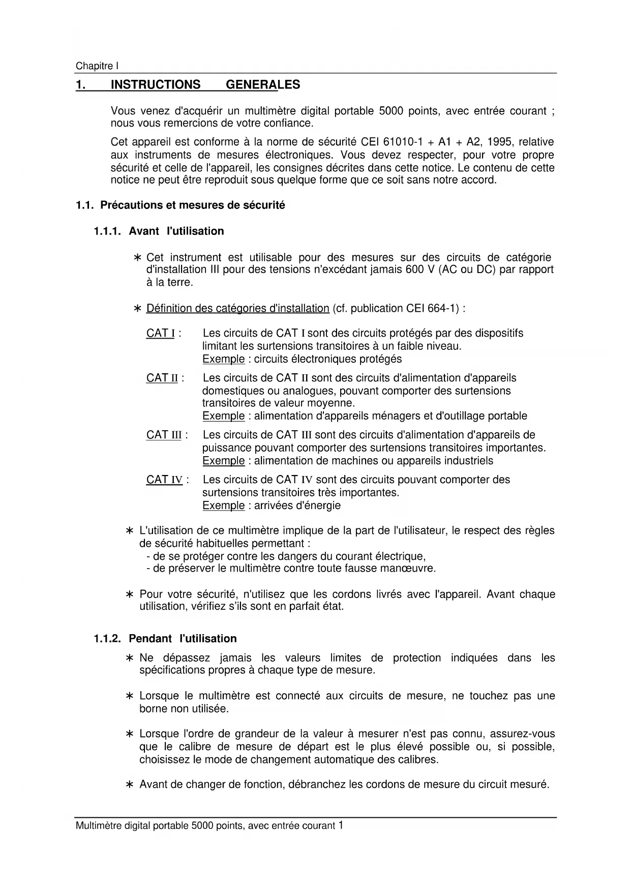 Vous venez d'acquérir un multimètre digital portable 5000 points, avec entrée courant ; nous vous remercions de votre confiance. Cet appareil est conforme à la norme de sécurité CEI 61010-1 + A1 + A2, 1995, relative aux instruments de mesures électroniques. Vous devez respecter, pour votre propre sécurité et celle de l'appareil, les consignes décrites dans cette notice. Le contenu de cette notice ne peut être reproduit sous quelque forme que ce soit sans notre accord. 1.1. Précautions et mesures de sécurité