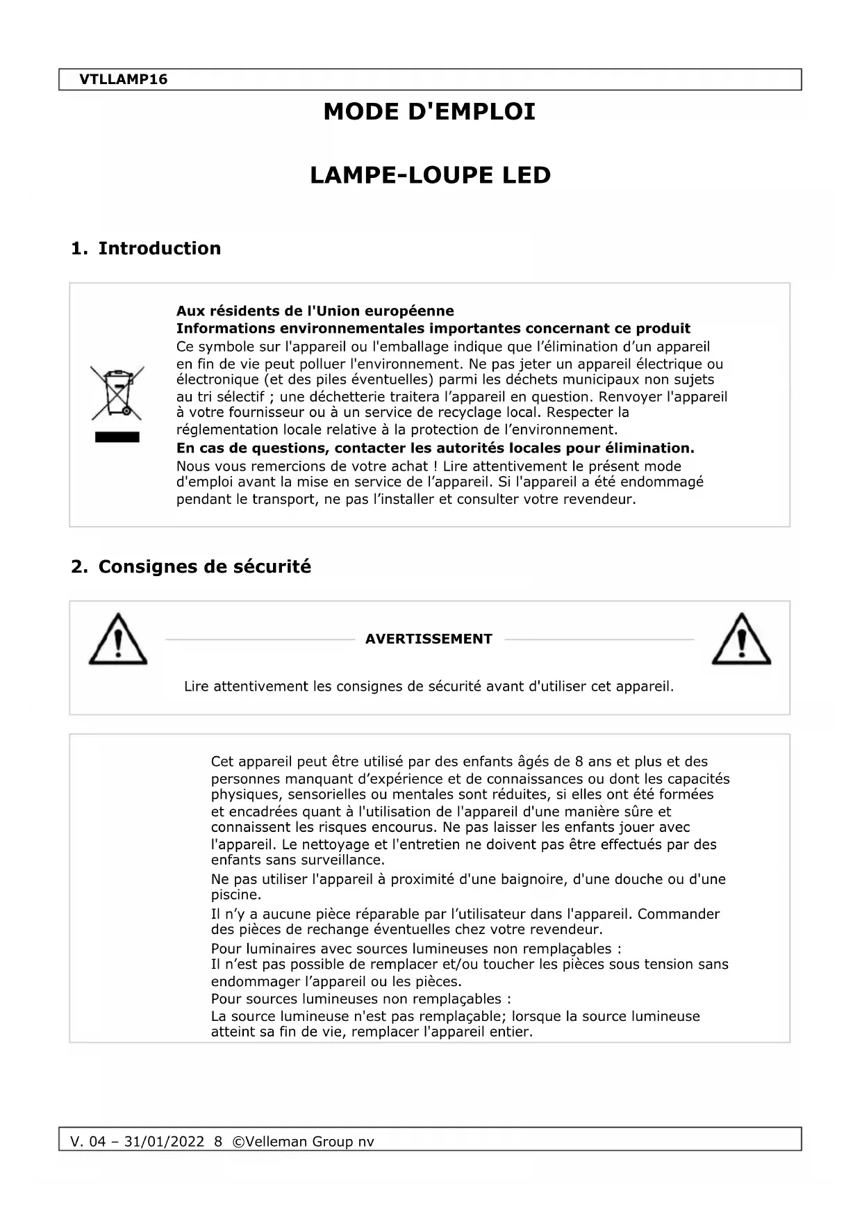 Retrouvez gratuitement la notice de l'appareil VTLLAMP16 VELLEMAN au format PDF.